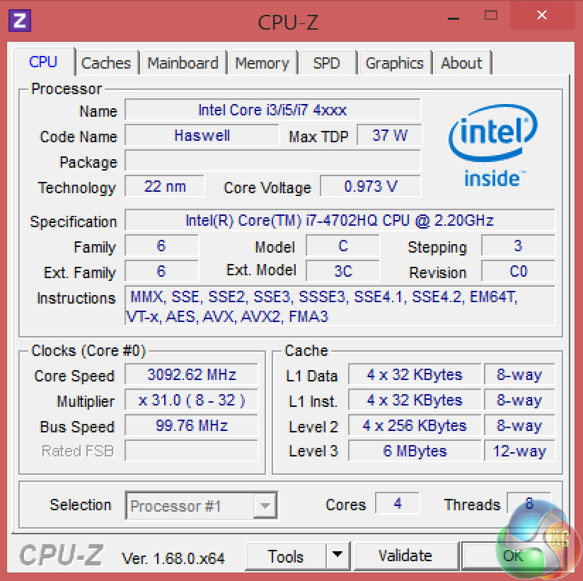 There's a few different hardware options with the XPS 15 9530 (see first page of this review), but this particular version comes with the 4th generation Intel i7-4702HQ CPU with 6MB of l3 cache. Its default clock speed is 2.2GHz, but this can be boosted up to 3.2GHz.