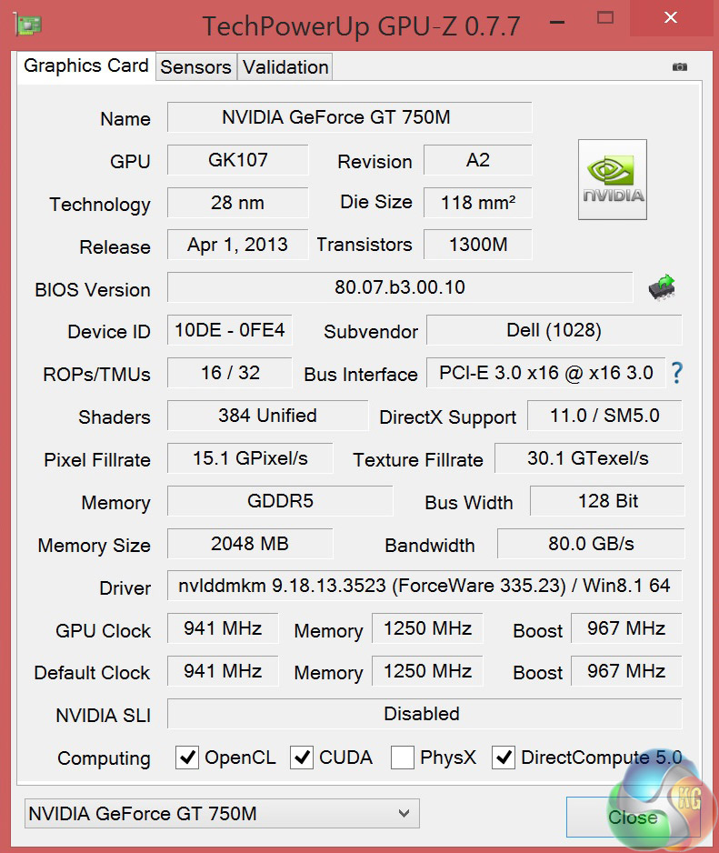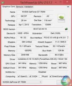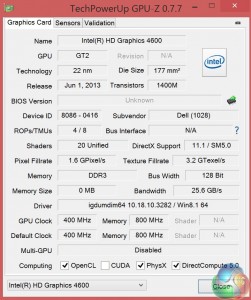 Memory wise, it's sporting 16GB (2x8GB) of dual channel DDR3 running at 1600MHz and an extra 2GB on the mobile GPU, a discrete Nvidia GT750M which runs at 941MHz and 1250MHz on the core and memory respectively. However that only kicks in when stressful applications are run, until then it makes use of an Intel HD 4600.