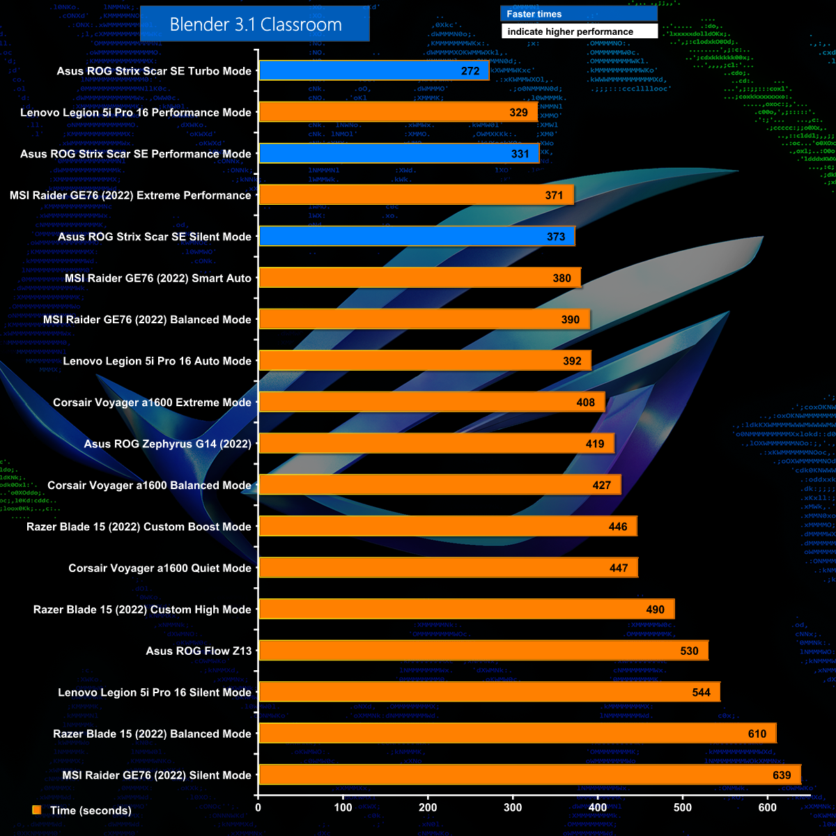 Blender 3.1 is a pure CPU test that repeats what we saw in Cinebench R23 Multi with the Asus winning by a decent margin in Turbo Mode.