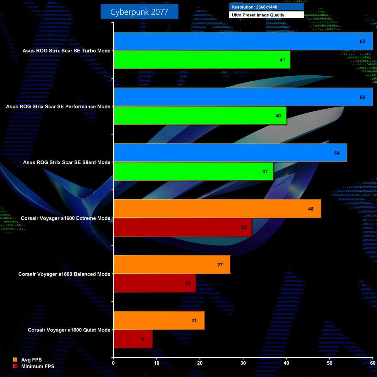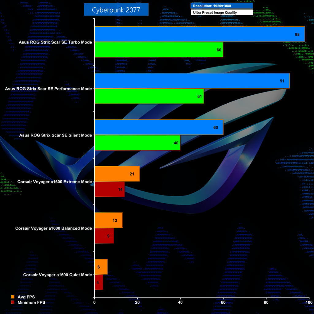 In the two higher power modes the Asus gave us a fine gaming experience in Cyberpunk 2077 at 1440p and was also fairly decent in Silent Mode.