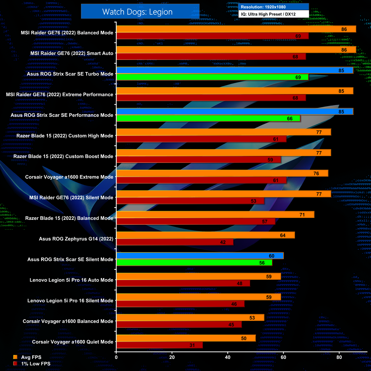 Watch Dogs: Legion at 1080p is a win for the MSI Raider GE76 that we reviewed earlier in 2022 and yes, it would be intriguing to retest that particular laptop. Anyway, the Asus once again does very handily and delivers a superb gaming experience.