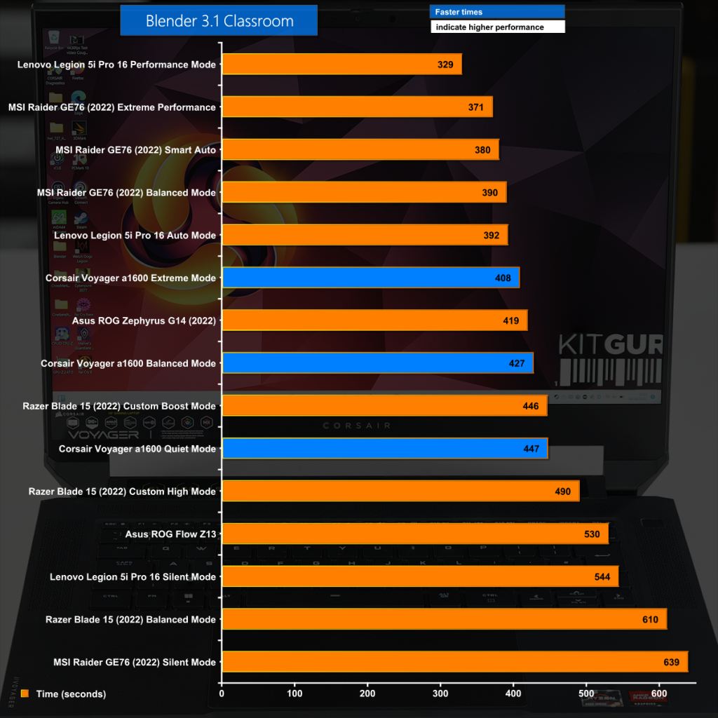 In Blender we see that CPU performance closely matches the Asus ROG Zephyrus. The Voyager a1600 is a punchy laptop that delivers exactly what we expect from its Ryzen 9 CPU.