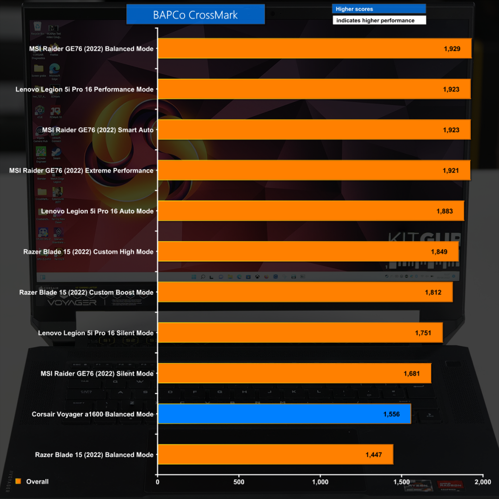 BAPCo CrossMark is a benchmark test that is heavily promoted by Intel and which appears to favour Intel hardware. We do not put any particular weight on this test and include it to give a sense where the Corsair Voyager a1600 sits in the pantheon of laptops that we have tested recently.