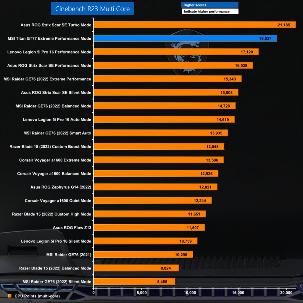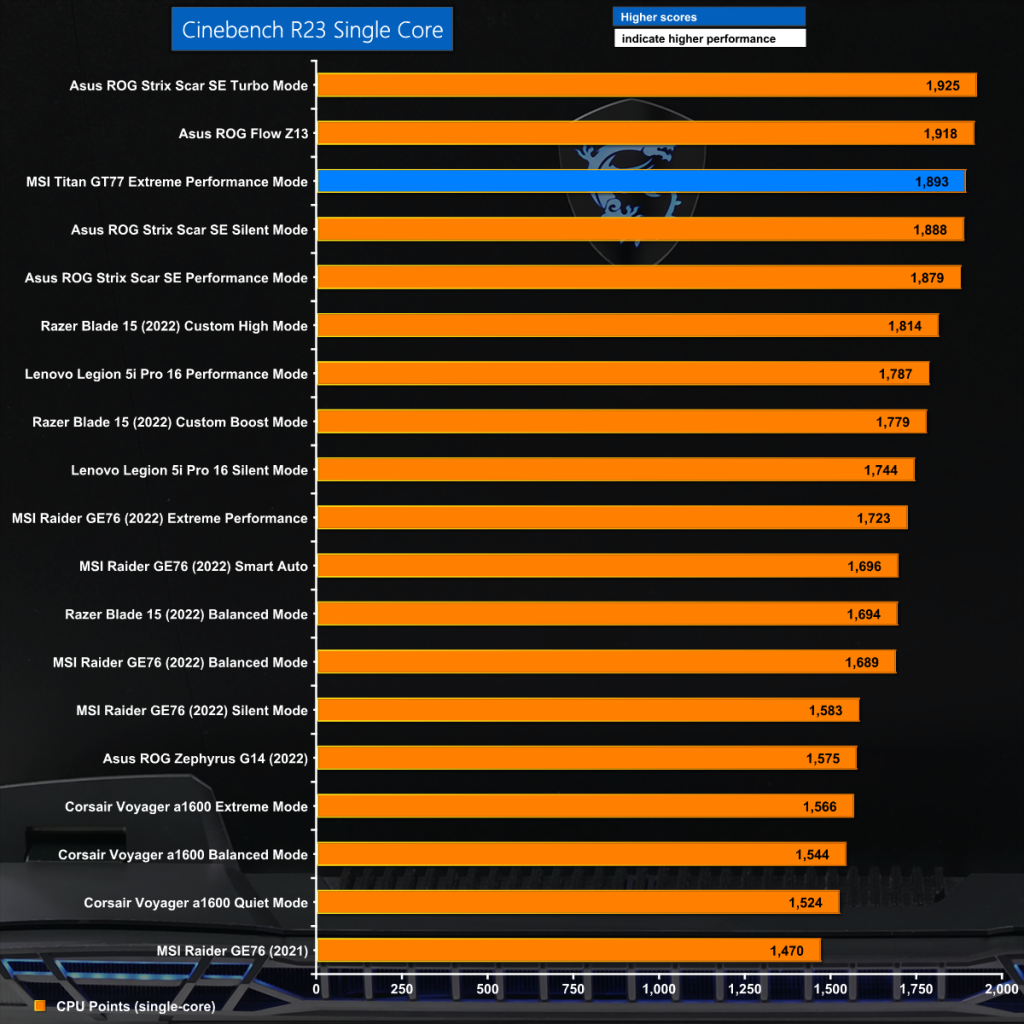 In Cinebench R23 Single Core there is very little to separate the Asus and MSI. As we explain in our video there is only a single test result for the Titan GT77 as the system switches into Extreme Performance Mode as soon as the benchmark test begins.