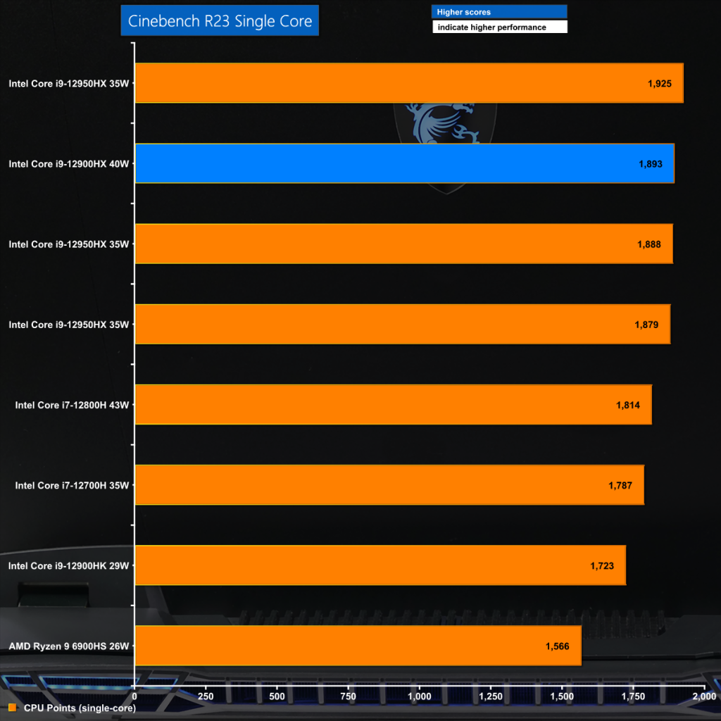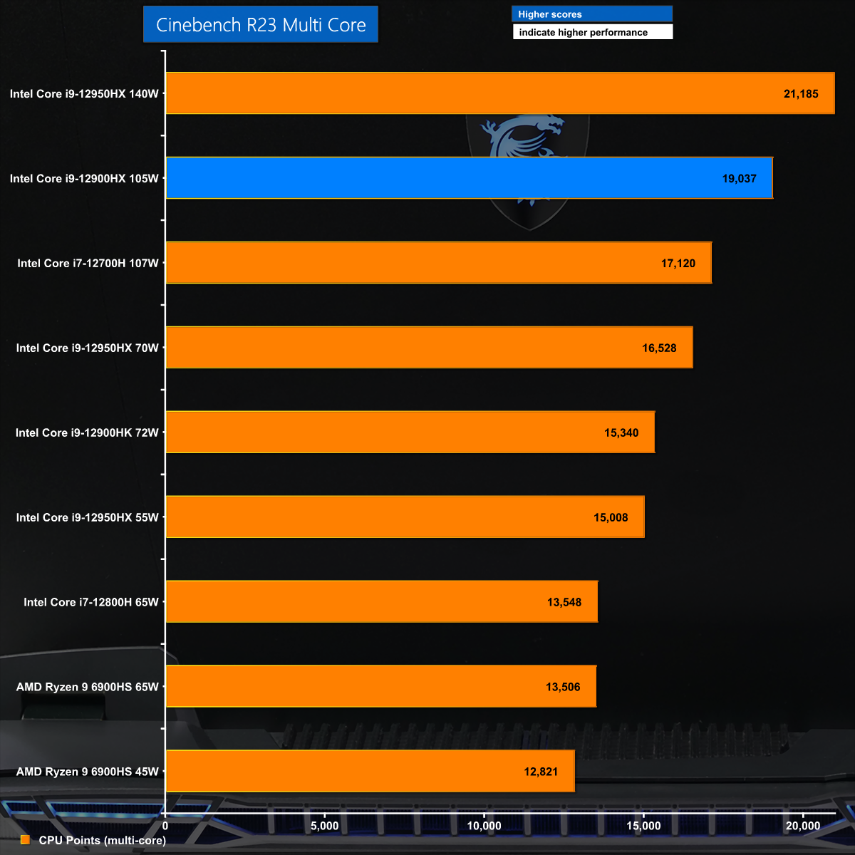 In Cinebench R23 Multi Core we see the MSI losing out to the Asus ROG Strix Scar 17 SE by a significant margin. This looks odd as the two laptops use CPUs that are very similar, however we can see what is going on.