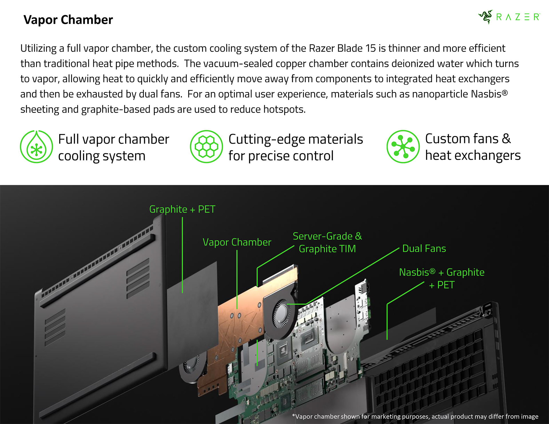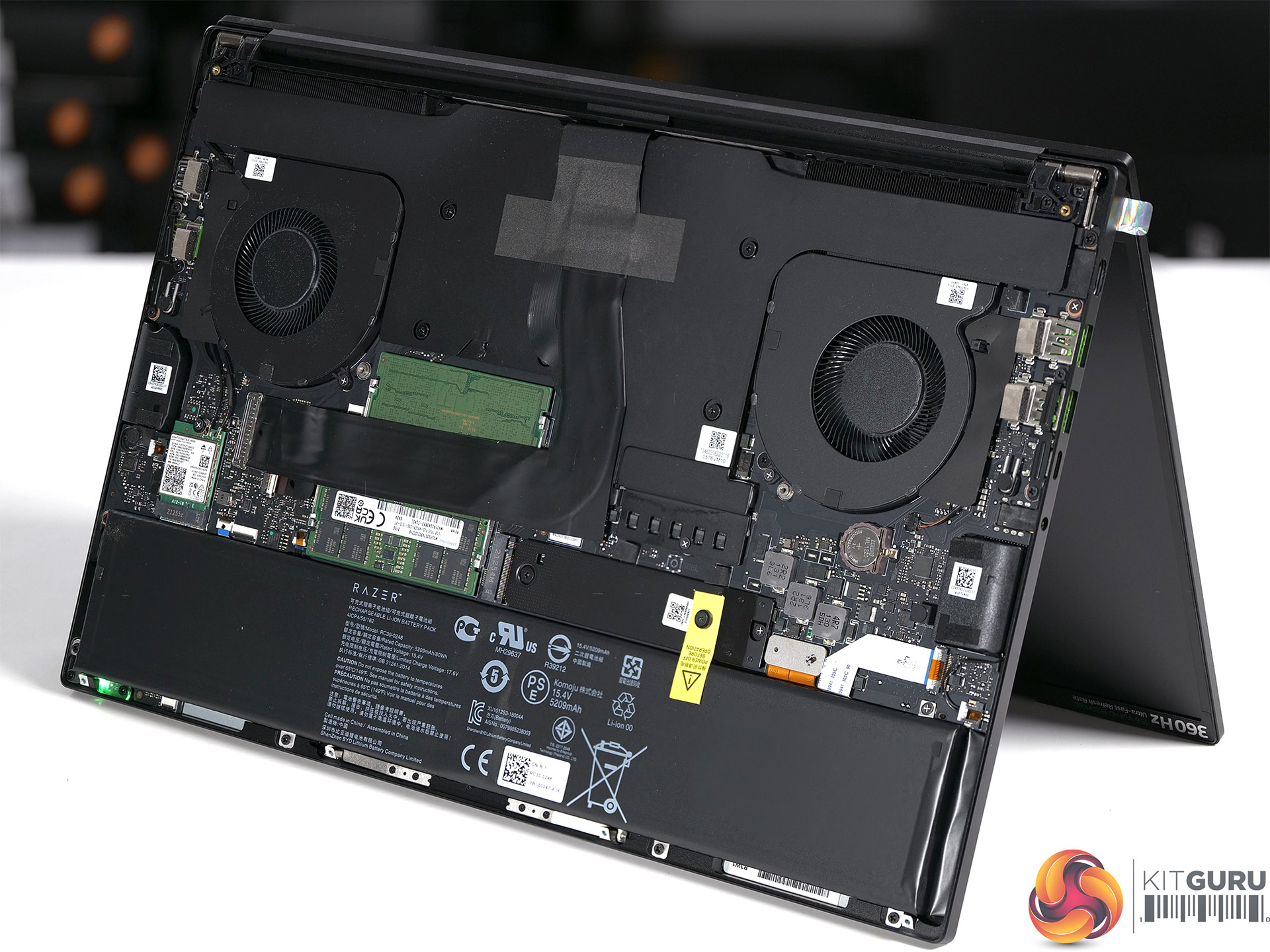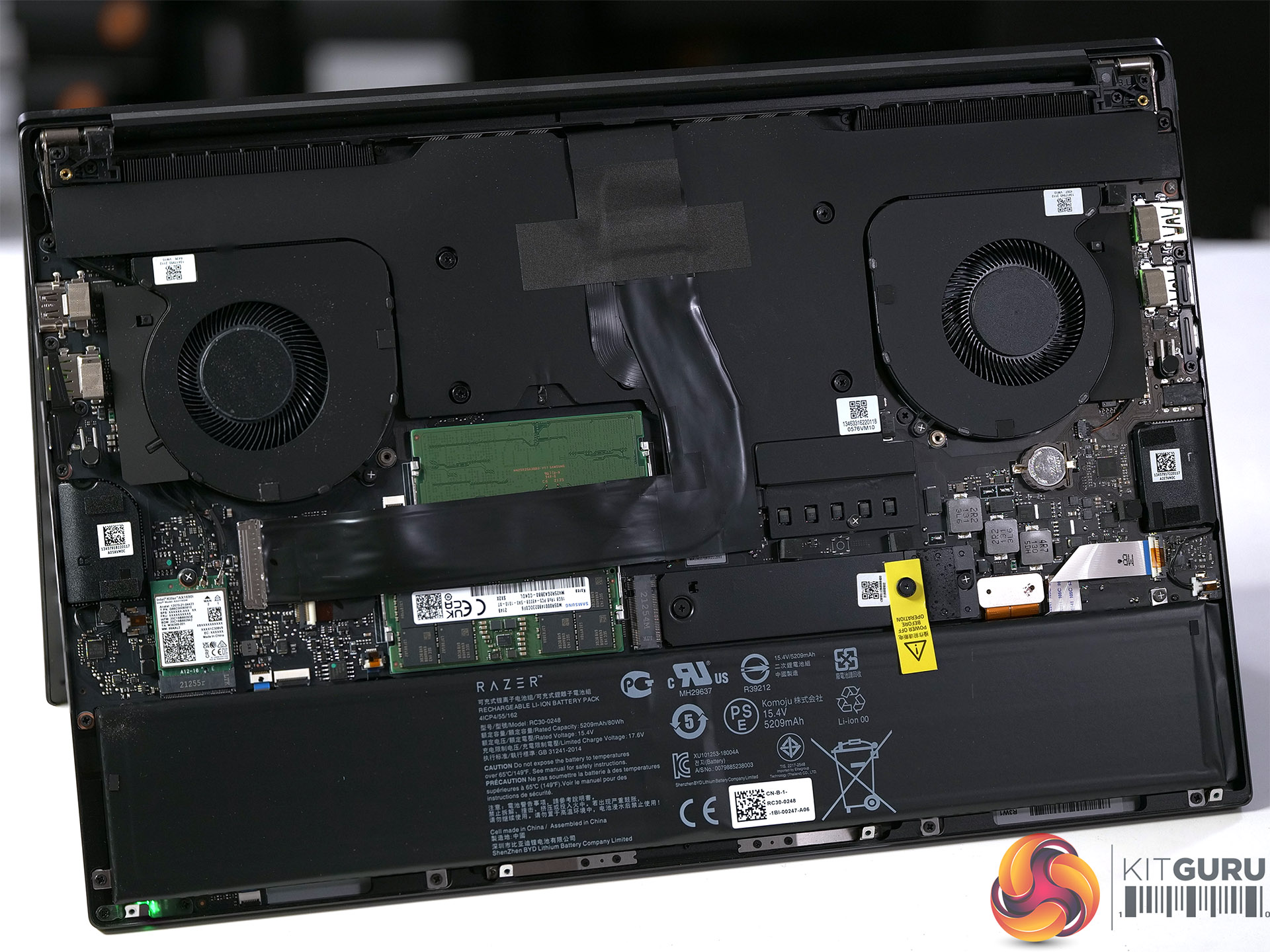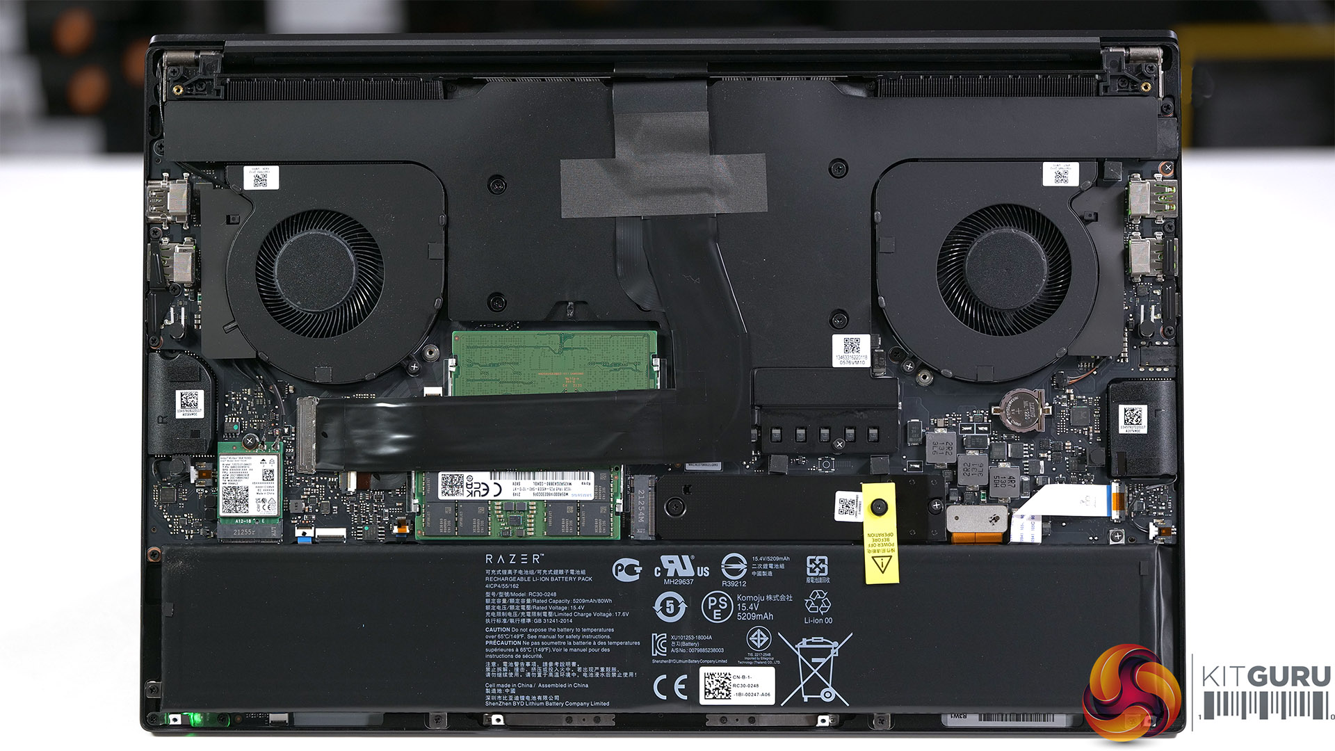 With the bottom cover removed we can see the Razer Blade 15 is packed with hardware. The 80Wh battery takes up a fair amount of space and a good part of the rest is required for the vapour chamber that cools both CPU and GPU.