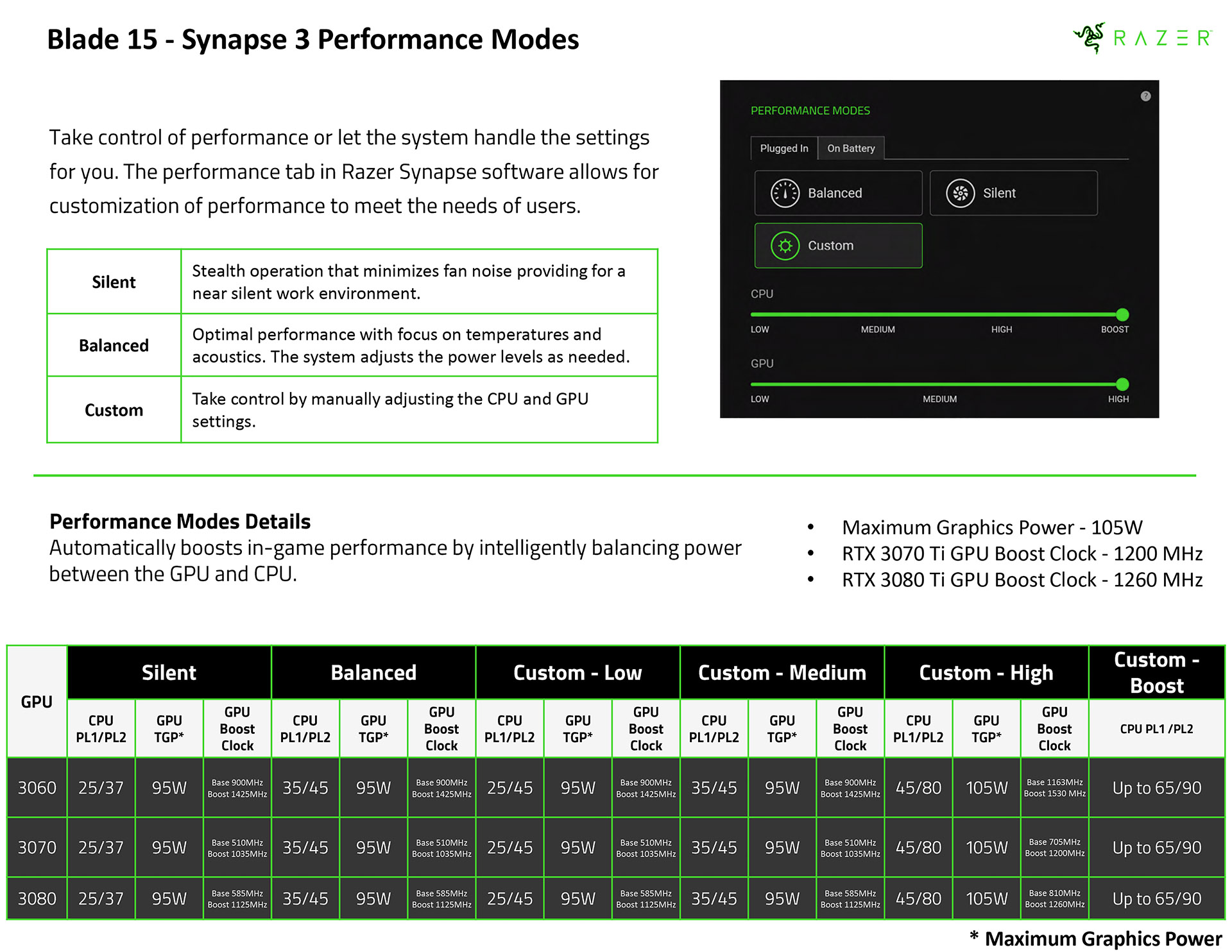 Razer's Synapse 3 software is key to the performance of the Blade 15 and controls the power limits for the CPU and GPU. As we demonstrate in our video, Balanced mode is the equivalent of Silent or Quiet mode. Changing to Custom-High mode allows the hardware to start working properly. It is only when you select Custom-Boost that you start to scratch the surface of what the RTX 3080 Ti can achieve by which time the fans are running fast and loud.