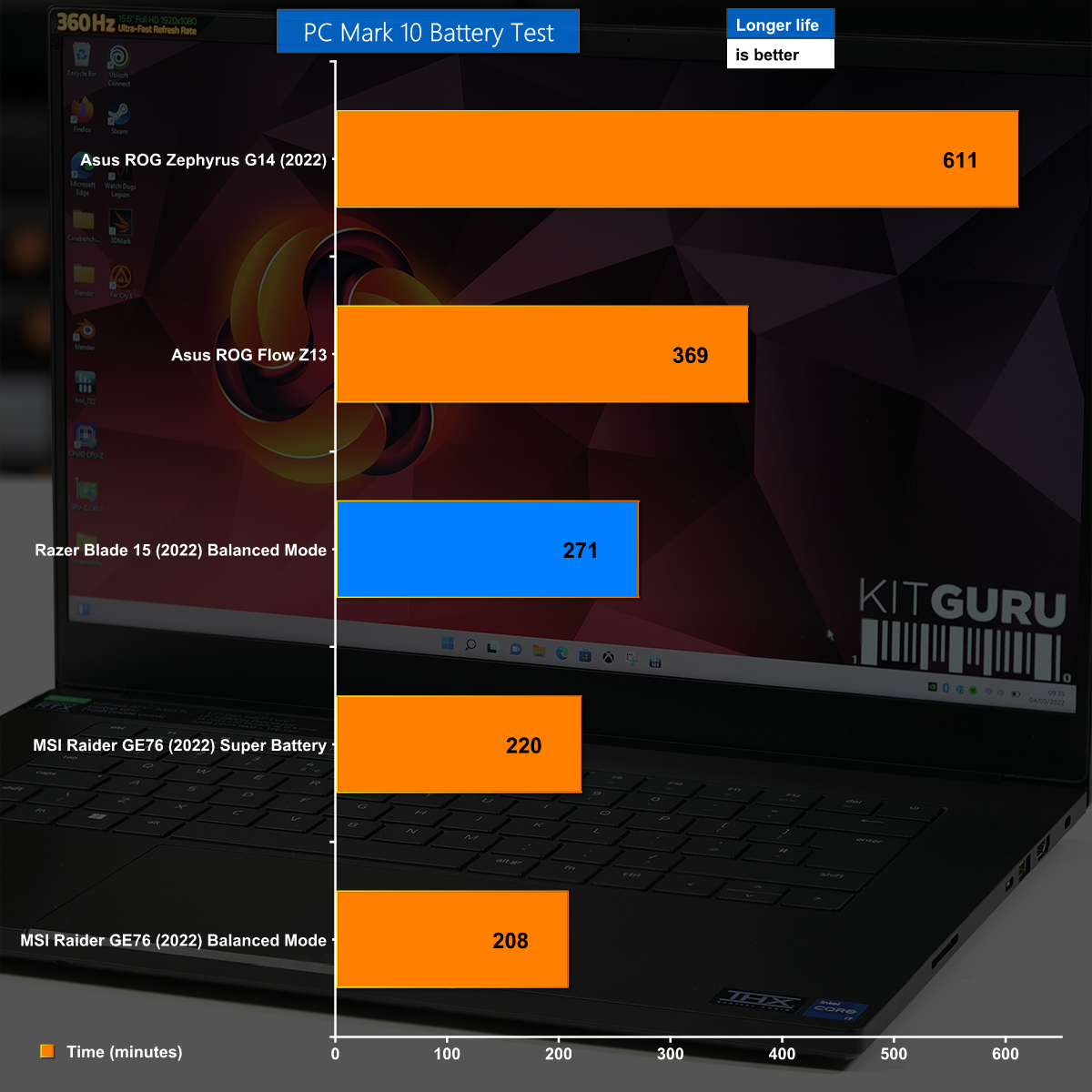 The latest Razer Blade packs a combination of Intel Core i7-12800H CPU and Nvidia RTX 3080 Ti graphics in a chassis that weighs 2kg and sports a 15.6-inch screen. We are reviewing the Full HD version with 360Hz refresh so there is plenty to talk about. Spoiler alert: we usually hate bundled apps so you may be stunned to learn that I have kind things to say about the included Synapse 3 software package. https://youtu.be/mEB7OcRCfyE Timestamps 00:00 Start 00:44 Details and specs 02:33 Display 03:12 Ports and Connectors 04:04 Keyboard 05:24 Speakers / software 06:23 A look inside the chassis 06:58 Razer Synapse software - testing modes 08:39 Test results 10:52 Leo's closing thoughts Specification Processor: 14-core Intel i7-12800H processor, Turbo Boost up to 4.8GHz, with 24MB of Cache Display: 15.6-inch FHD 360Hz, 100% sRGB, 2ms, individually factory calibrated Graphics: Nvidia GeForce RTX 3080 Ti 16GB GDDR6 VRAM Memory: 32GB DDR5 4800MHz dual-channel memory (slotted) Storage: 1TB SSD M.2 NVMe PCIe 4.0 x4 Connectivity: Killer Wireless Wi-Fi 6E AX1690, Bluetooth 5.2 Input/Output: 1x Thunderbolt 4 USB-C 2x USB-C 3.2 Gen 2 - Supports Power Delivery 3 (15W) 3x USB-A 3.2 Gen 2 Audio: 3.5mm Combo-Jack, Stereo 2.0, 8 Speakers, THX Spatial Audio, 2-Mic Array Battery: 5209Ah/80Wh Power adapter: 230W Dimensions: 16.99mm x 235mm x 355mm Weight: 2.01kg OS: Windows 11 Home The hardware in the 2022 Razer Blades has been overhauled with an Intel 12th Gen CPU, Nvidia RTX 30-series graphics and DDR5 memory. The model we have on review packs a Core i7-12800H, RTX 3080 Ti graphics and 32GB of DDR5-4800 RAM. With the bottom cover removed we can see the Razer Blade 15 is packed with hardware. The 80Wh battery takes up a fair amount of space and a good part of the rest is required for the vapour chamber that cools both CPU and GPU. Our review sample of the Blade 15 was fitted with a 360Hz Full HD display which looks very good, albeit the brightness is nothing special at 300 nits. We would be interested to see the 240Hz Quad HD option, however the third choice of a 144Hz 4K display does not make much sense to us as the size is simply too small. Razer's Synapse 3 software is key to the performance of the Blade 15 and controls the power limits for the CPU and GPU. As we demonstrate in our video, Balanced mode is the equivalent of Silent or Quiet mode. Changing to Custom-High mode allows the hardware to start working properly. It is only when you select Custom-Boost that you start to scratch the surface of what the RTX 3080 Ti can achieve by which time the fans are running fast and loud. Testing and Performance - CPU In the Multi Core test of Cinebench R23 the Razer Blade does a reasonable job, provided you give it enough power to work correctly, however it is trounced by the competition. In the Single Core test of Cinebench R23 we see that power plays little part in the equation and the Razer Blade performs well. Blender 3.1 goes the same way as Cinebench R23 and the limitations on power are clear for us to see. The CPU element of 3D Mark Time Spy is interesting as it allows the Razer Blade to stretch its legs. We do not understand how it manages to beat the faster MSI Raider but score one for Razer. BAPCo CrossMark tests the whole system and we can see the impact of restricting power to both the CPU and the GPU as the results are fairly dire for the new Blade. Testing and Performance - Games Marvel's Guardians of the Galaxy shows the Razer Blade delivering a decent gaming experience however it falls a long way short of the potential of the 360Hz display and is beaten to the tune of 20fps by the MSI Raider. In Watch Dogs: Legion the frame rates are consistently above 60fps which means the game is both playable and looks great, however the Raider runs 10fps faster. Far Cry New Dawn also shows the Razer Blade 15 performing well however we can see the true potential of the hardware in MSI's Raider where it is delivering 10-15 more frames per second. Moving on to Far Cry 6 we have another good gaming experience however the Razer is missing out to the tune of 10fps. Battery and Closing Thoughts Battery life is acceptable without being anything special and you will most likely want to travel with the charger in your backpack at all times. We were excited to see the changes Razer has made with the new Blade 15 but it quickly became clear the laptop is fighting a losing battle against power and heat. We can see the evidence in the name as the smaller Blade14 chassis is used for AMD CPUs while the combination of Intel and Nvidia hardware requires the larger Blade 15 or 17 chassis. It is surely no coincidence the MSI GE76 Raider that we refer to throughout our review uses a substantial 17-inch chassis. Razer has employed a large vapour chamber cooling system that cools both the CPU and GPU and has then topped off the system with their Synapse 3 software which controls power limits, fan curves, Optimus/Dedicated GPU settings and RGB lighting in the keyboard. The settings within Synapse 3 give us a clear picture of the compromises faced by Razer. In Balanced mode the laptop is lovely and quiet, however the CPU is limited to 35W PL1 and the graphics to 95W which effectively cripples the expensive hardware. In Custom High mode the CPU operates at its 45W TDP and the graphics have 105W to work with. Push things to the limit with Custom Boost mode and the CPU runs on 65W, the maximum graphics power is 105W and the cooling fans are howling away and making a fair racket. Contrast that with the larger MSI GE76 Raider which can feed 72W to the CPU (the PL1 limit is 110W) and 165W to the graphics and you can see exactly why the Razer Blade 15 is crushed by the MSI Raider GE76 in our charts. You can buy the Razer Blade 15 (2022) directly from Razer for £3899.99 HERE. Discuss on our Facebook page HERE. Pros: Colourful, sharp, fast screen. Lovely large glass touchpad. Razer Synapse software works well. Smart styling and premium feel, al