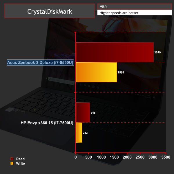 There are no problems when it comes to SSD speeds. The Samsung drive in the Zenbook returned read and write figures of 3,019MB/s and 1,594MB/s – excellent results that are several times faster than the SATA drive inside the HP machine.