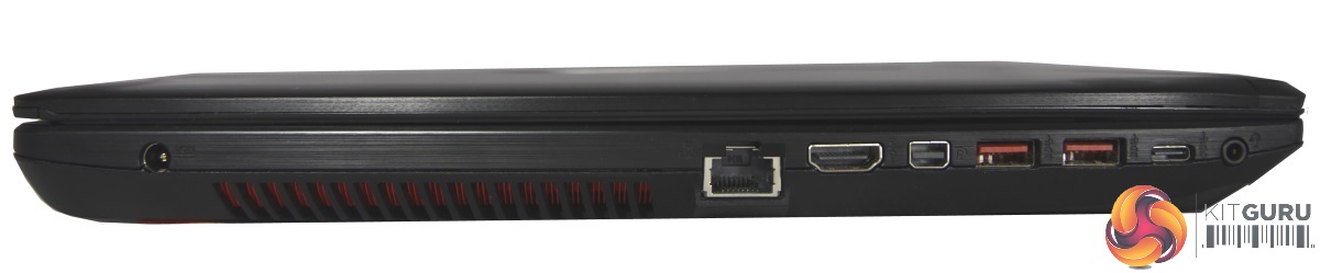 Connectivity is another area where this particular Republic of Gamers laptop impresses. It offers pretty much every connection you would expect from a machine in its price class. On the left, this constitutes the power socket, RJ45 LAN jack, full size HDMI port, mini DP (DisplayPort) 1.2, two standard USB 3.0 connectors, and, in a nice touch, a USB 3.1 Type-C port.