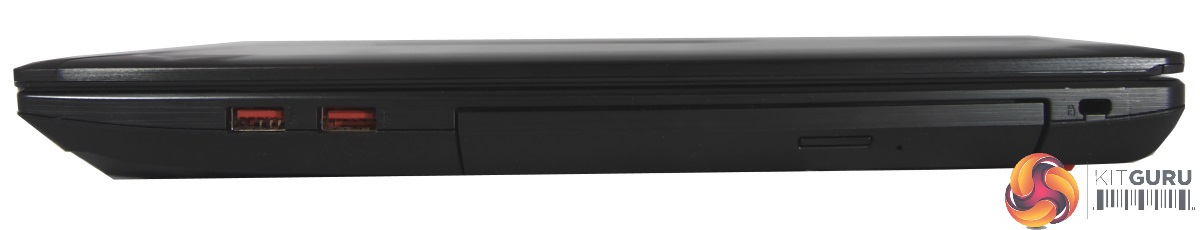 On the laptop’s right side we find the remaining connections: another USB 3.0 port and a single USB 2.0 (it might have been nice if there was colour coding to indicate the difference such as making this port black instead of red, but at least the icon gives a visual indication). This is followed by the tray-loading DVD drive and Kensington lock slot.