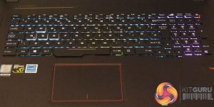 As you would expect given the ROG Strix GL753VD’s price point, the keyboard is not mechanical; rather it’s a membrane-based chiclet affair. Key-spacing is generally good; however, we did occasionally hit the up-cursor key instead of right shift, as it doesn’t extend all the way under the Enter key – which itself is a tad on the narrow side.