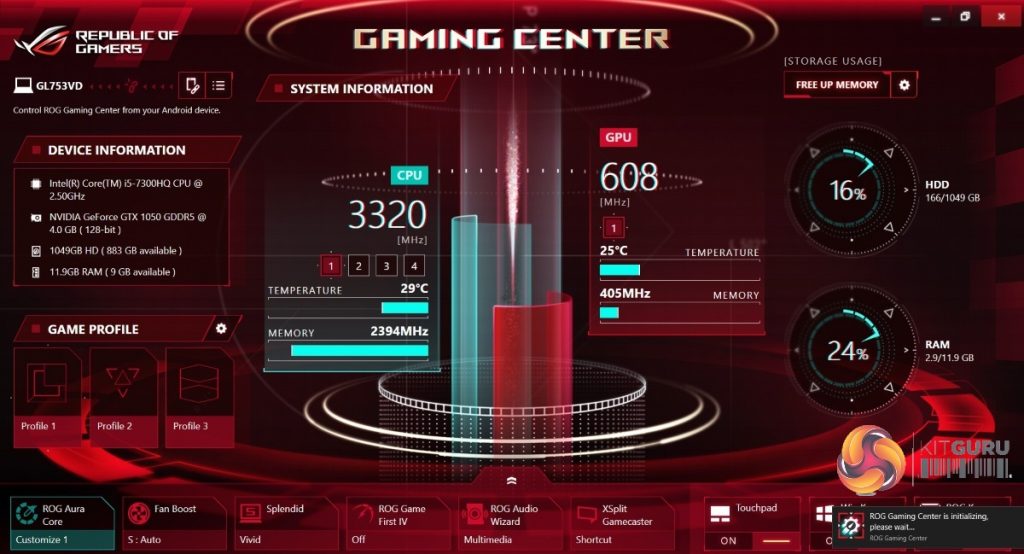 This includes an Eye Care setting to reduce potentially harmful blue light, Normal and Vivid presets, Tru2Life video processing tech, and a Manual mode where you can adjust colour temperature. - ROG Gaming Center – perhaps the most interesting of the lot, this is the command interface for the GL753VD, and it’s considered so important there’s a dedicated keyboard shortcut to summon it. This centre gives you basic device specs, lists the realtime CPU and GPU frequencies plus temperatures, shows storage and RAM usage, and allows you to access the above apps in addition to Fan Boost and ROG Audio Wizard.