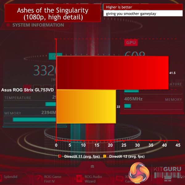 Just like Tomb Raider, Ashes drove this Republic of Gamers machine to its limit, and activating DirectX 12 slowed it to a crawl. Is there much point to a card being compatible with the latest DirectX version if it can’t actually run most titles at playable framerates?