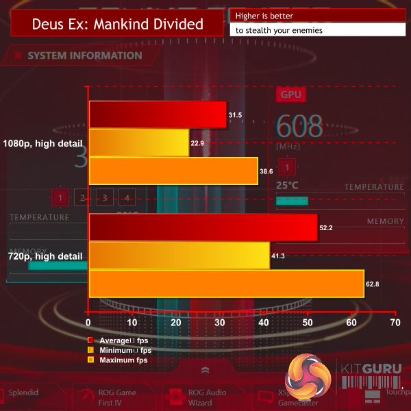 The less demanding Deus Ex: Mankind Divided fared better, but even here the GL753VD struggled at its native screen resolution, and we had to drop it down significantly to get a smooth experience.
