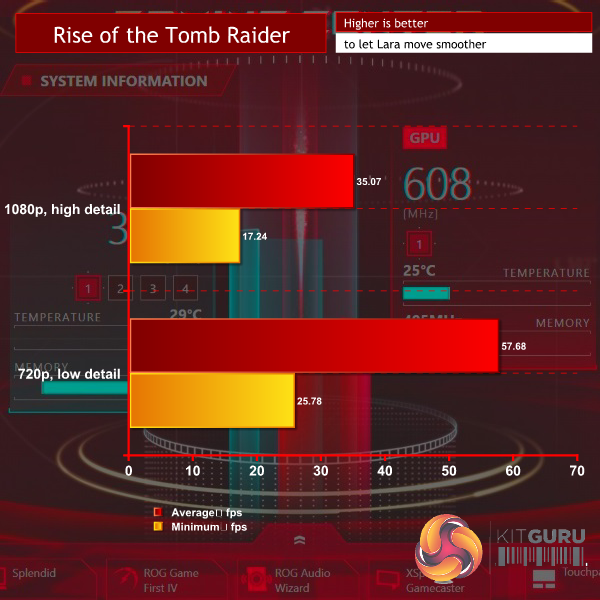 In our first gaming test, the ROG Strix GL753VD already shows the limitations of its GTX 1050 graphics. At the screen’s native resolution of 1920 x 1080 and on Rise of the Tomb Raider’s default High detail settings running in DirectX 11 mode, it barely scraped by with a 35fps average, while dipping as low as 15.21fps in the Syria section.