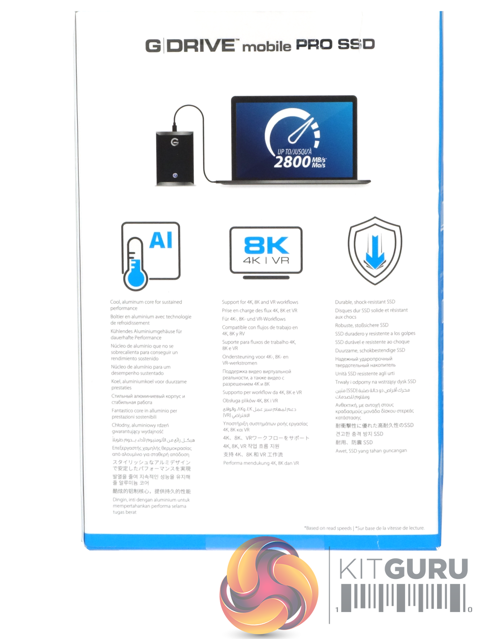The rear of the box has an illustration of the drives speed. Under this are three icons showing that the drive has an aluminium heatsink, supports 4K, 8K and VR workflows and that it's shock resistant. Under these icons are multilingual descriptions of these three features.