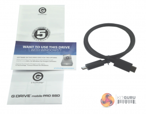 The box bundle with the drive simply comprises a 0.5m Thunderbolt 3 cable, quick start guide, information card on how the drive is formatted and warranty info booklet.