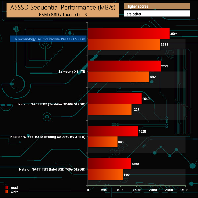 Using the more demanding ASSSD benchmark saw the Sequential reads drop to 2,504MB/s with writes at 2,211MB/s. Both of these figures make the G-Drive mobile Pro SSD the fastest single drive external device we have tested to date with the benchmark.