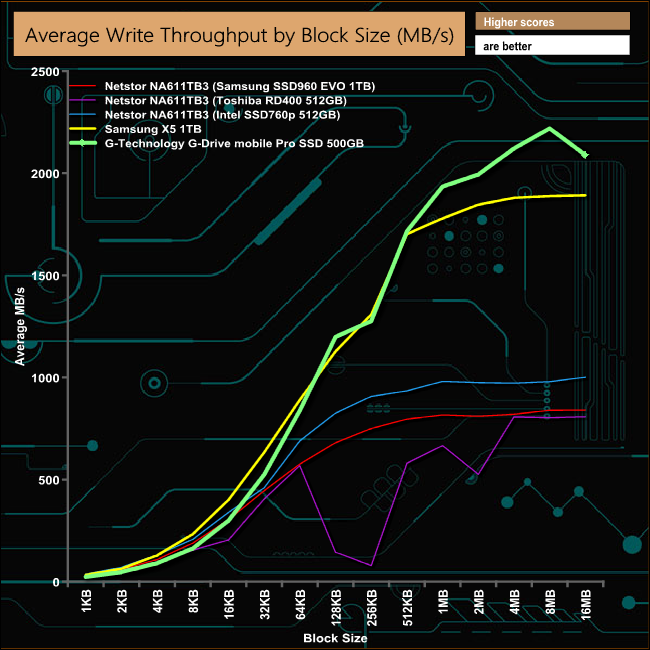 The peak write throughput figure came a the 8MB block mark at 2,219.02MB/s.