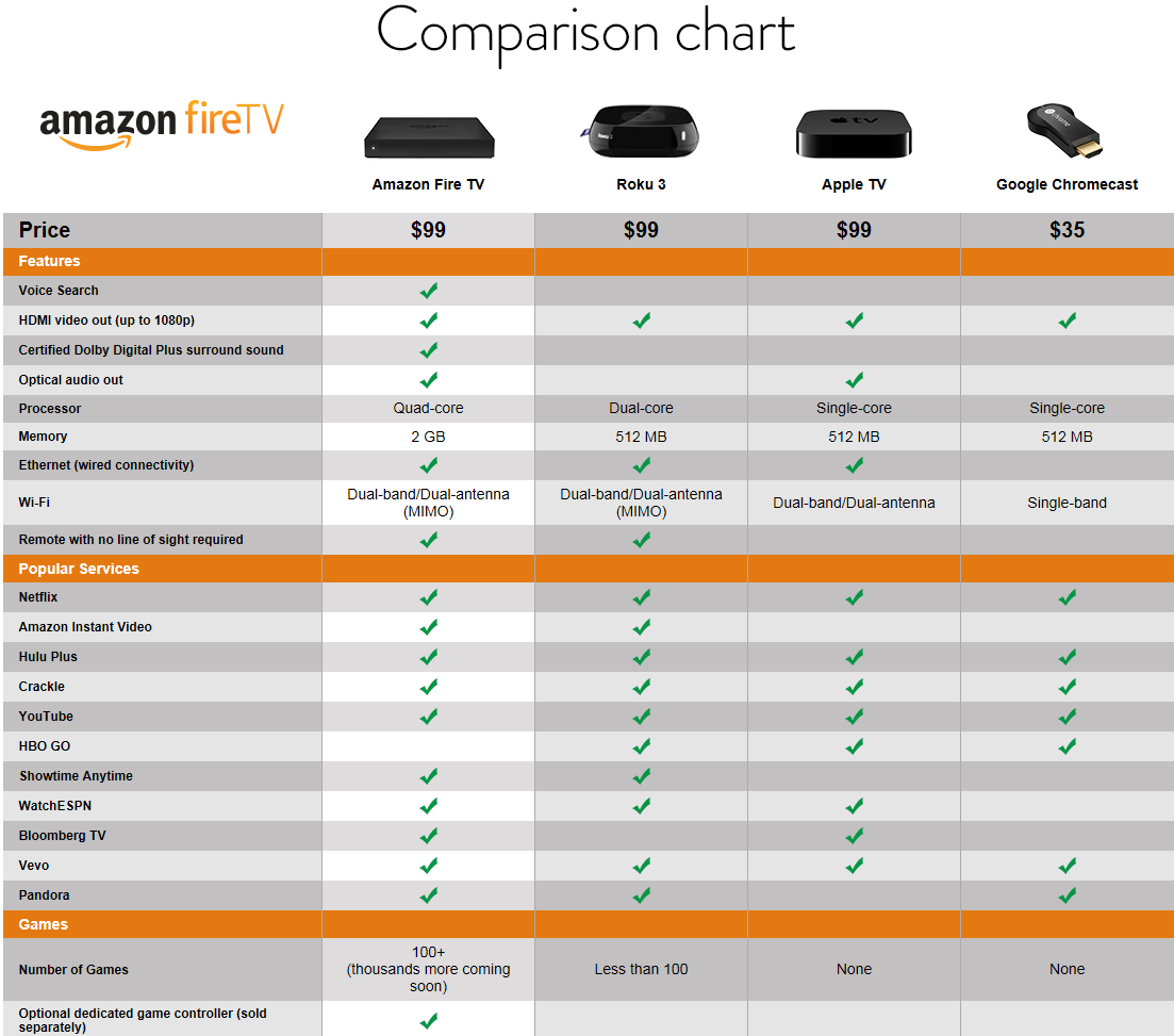 Unlike other set-top-boxes, Amazon Fire TV not only supports video and music services, but also has proper support for video games. The unit not only comes with advanced Adreno 320 graphics engine, but is compatible with Amazon Fire game controller (a wireless Bluetooth game controller with up to 55 hours of battery life) that has one D-pad, two analogue sticks, shoulder buttons, analogue buttons, media controls and so on. The controller costs $39.99 in the U.S.