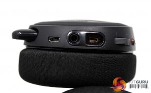 A lot of the functionality has been placed on the ear cups of the SteelSeries Arctis 3 Bluetooth, with three connectors on the left ear cup – one microUSB for charging, one proprietary connector for the primary headset cable, and also one 3.5mm input which ‘shares' whatever you're listening to so a friend can plug in and listen as well.