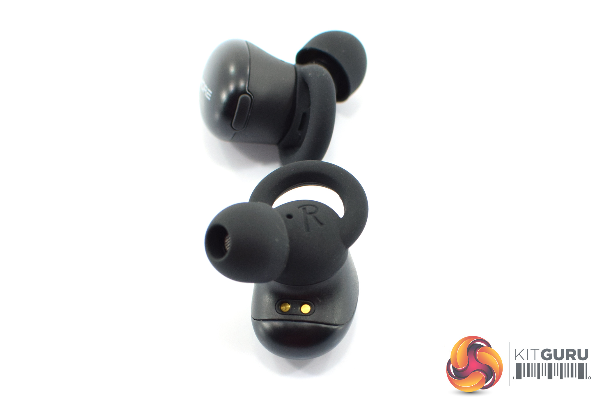 As TWS earphones go, these aren't too bulky either, with measurements of 27 x 27 x 23mm. They're obviously a bit thicker than normal earphones, but they have to house a battery as well. Each earphone is also home to a small button which is used to control your music playback, answer calls and even access your digital assistant. Lastly, the underside of each earphone reveals two gold contact points for charging with the include case.