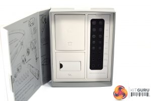 If we remove the part of the box with the earphones in, underneath that we find all the accessories neatly laid out in small compartments.