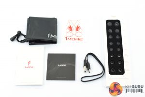 1MORE has been quite generous with the bundle, as we find two pieces of documentation alongside a USB-C cable (for charging), as well as a soft carry bag and a sticker. In terms of ear tips, we have the same bundle that came with the Quad Driver – meaning a total of 5 silicon pairs and 3 foam pairs, ranging in size from 10mm to 14.5mm.