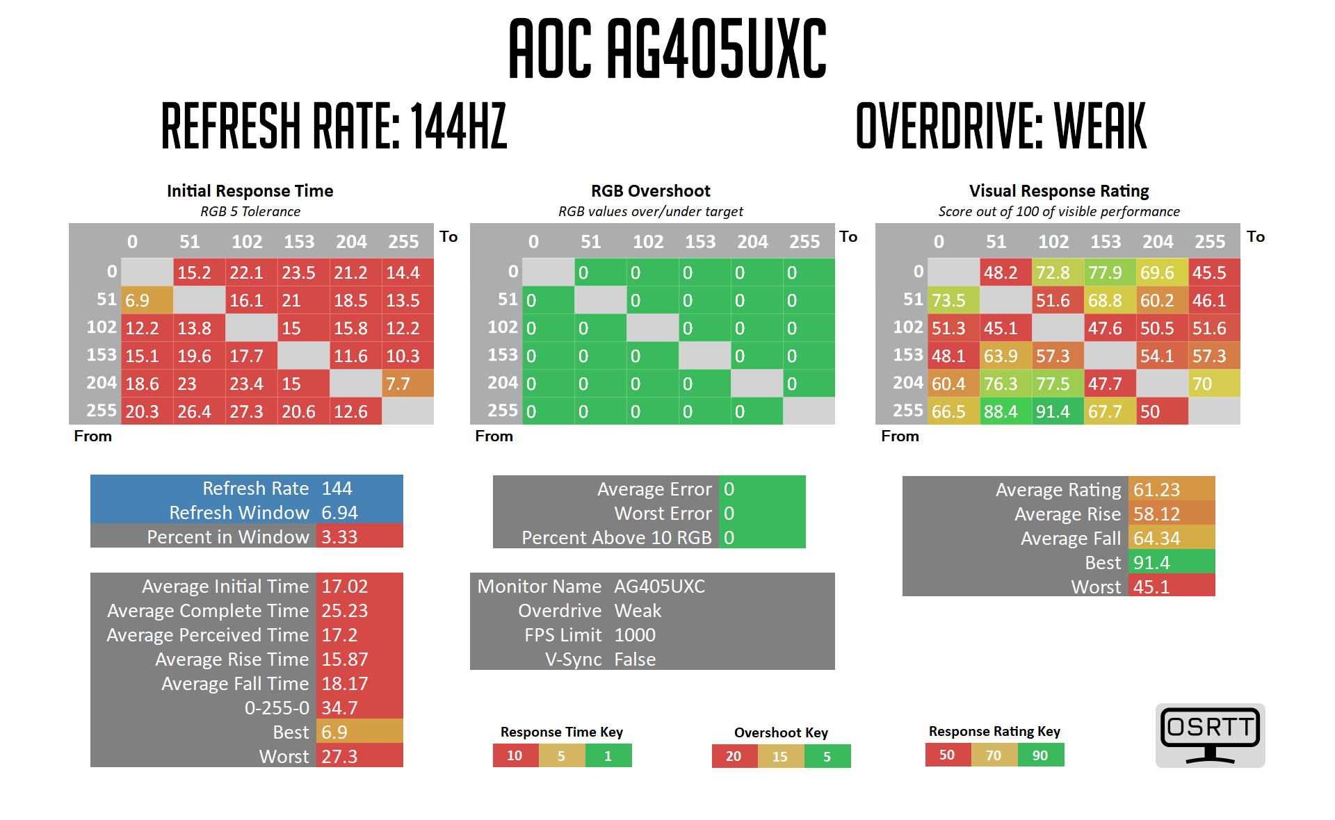 We test the AG405UXC at 144Hz, using all four of the overdrive settings found within the OSD.