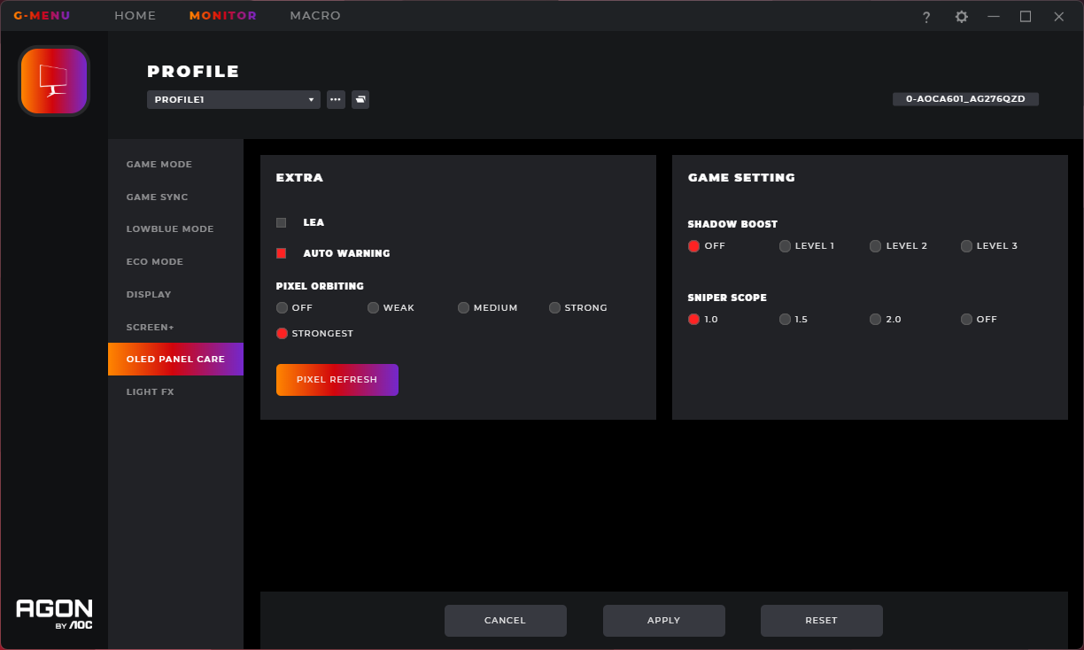 AOC does also offer its G-Menu software, giving users direct control over monitor settings from their desktop. This works well, apart from being a touch slow at times, and is generally fully featured. I imagine most people would use it to update the firmware, which is a good ability to have on any OLED screen.