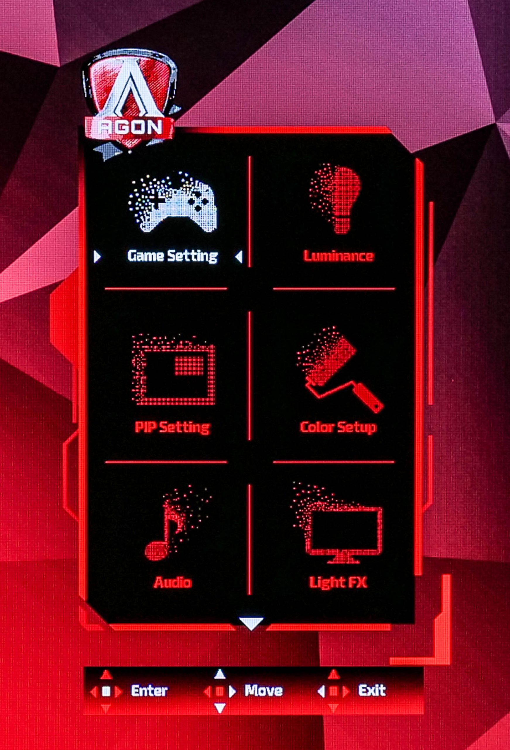 The OSD will be familiar if you've seen any of our other AOC Agon reviews, with everything is split into eight main tabs – Game Setting, Luminance, PIP Setting, Color Setup, Audio, Light FX, Extra, and OSD Setup: