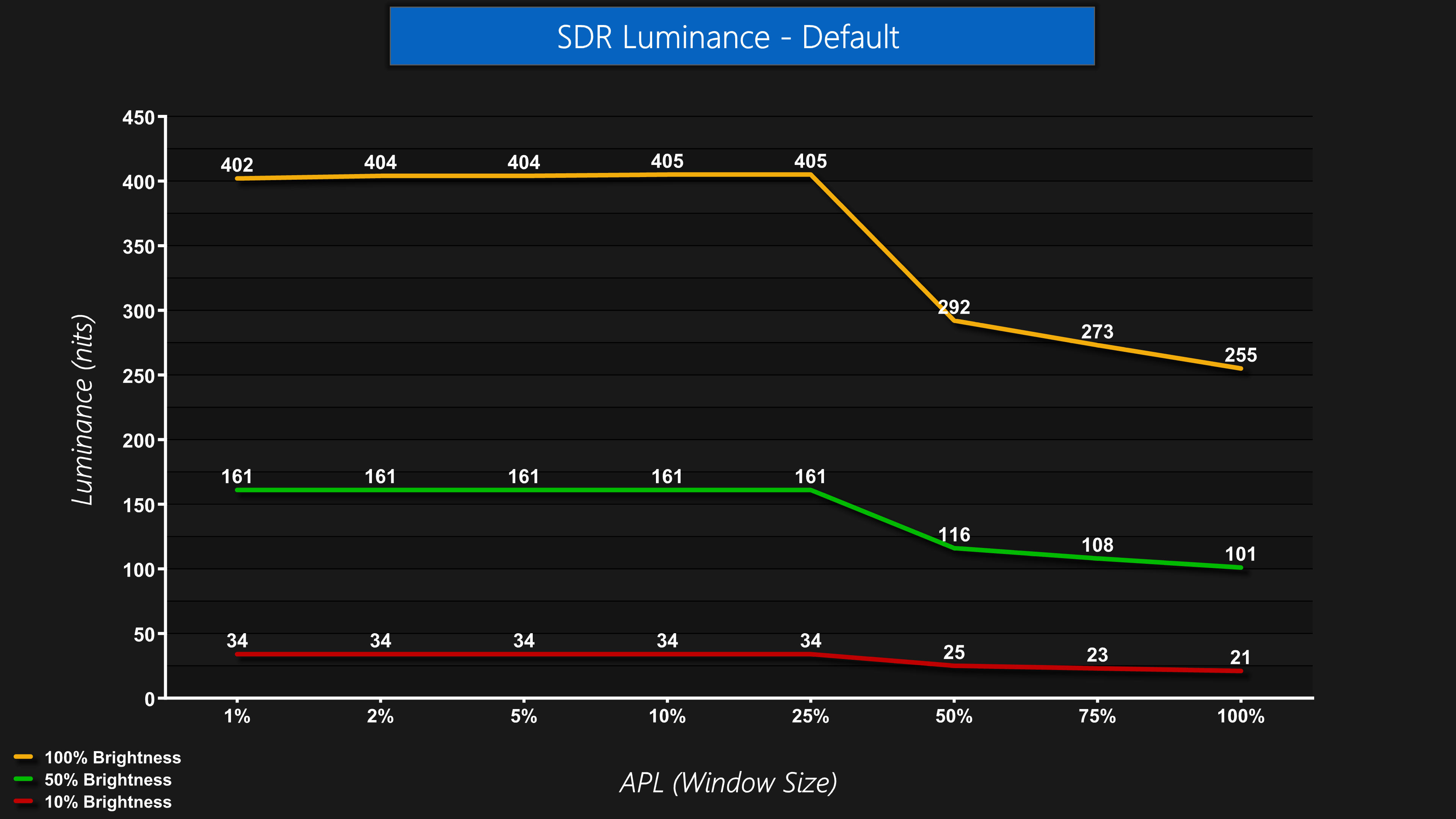 One thing to be aware of however, is that brightness is not fully uniform due to the Auto Brightness Limiter (ABL) – something that is common for WOLEDs. This means that brightness of on screen elements will decrease as the window size increases, resulting in fluctuating brightness depending what is shown on screen.