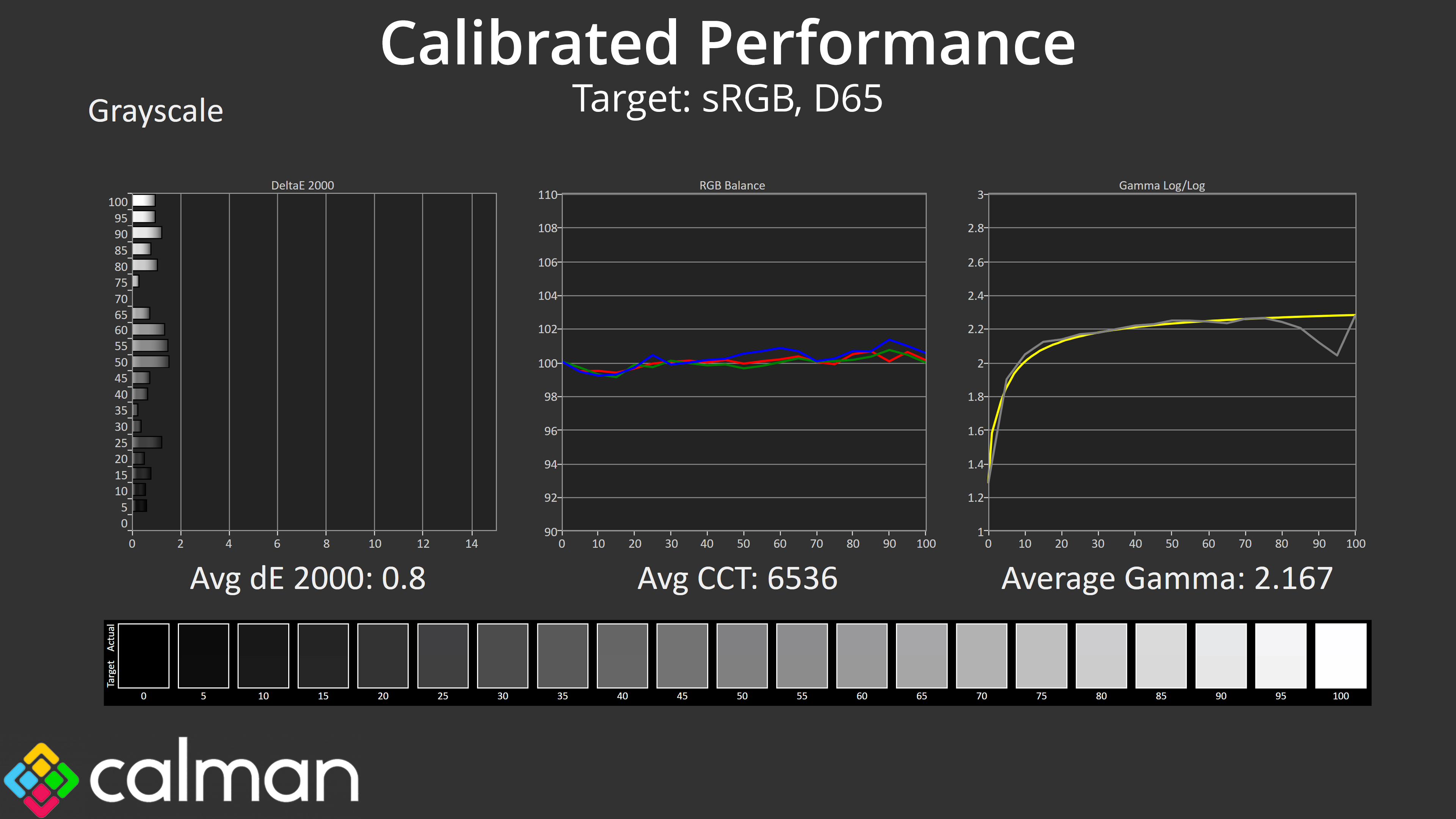 It's no surprise that we get great results when calibration using Calman Ultimate. Gamut locks in much better than what we saw from the sRGB emulation model and greyscale is pretty much flawless, with super gamma tracking too. Saturation inaccuracy is almost completely removed, with a new average deltaE of 0.92, while colour accuracy is also improved with a new average dE 2000 of 1.41.