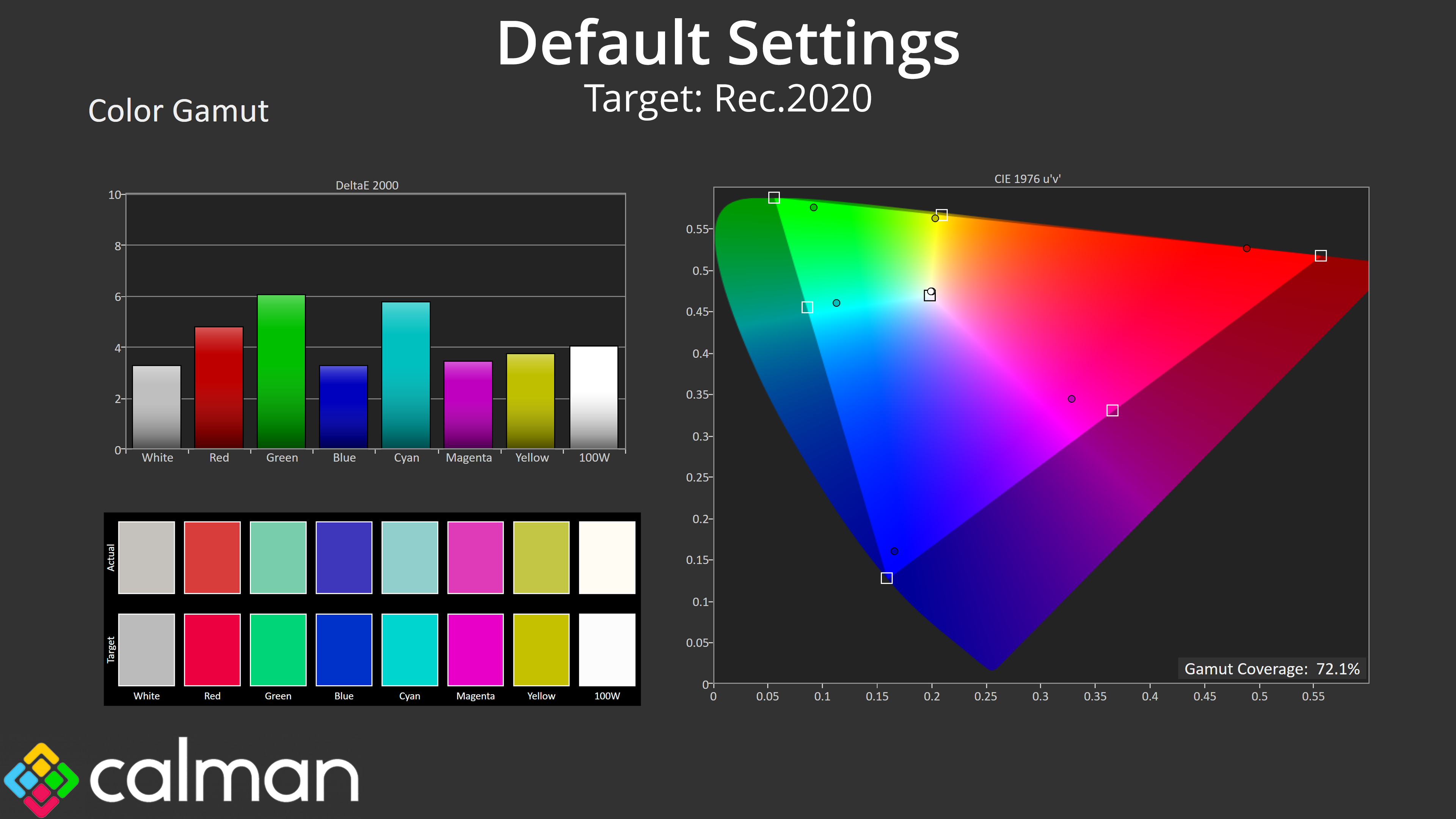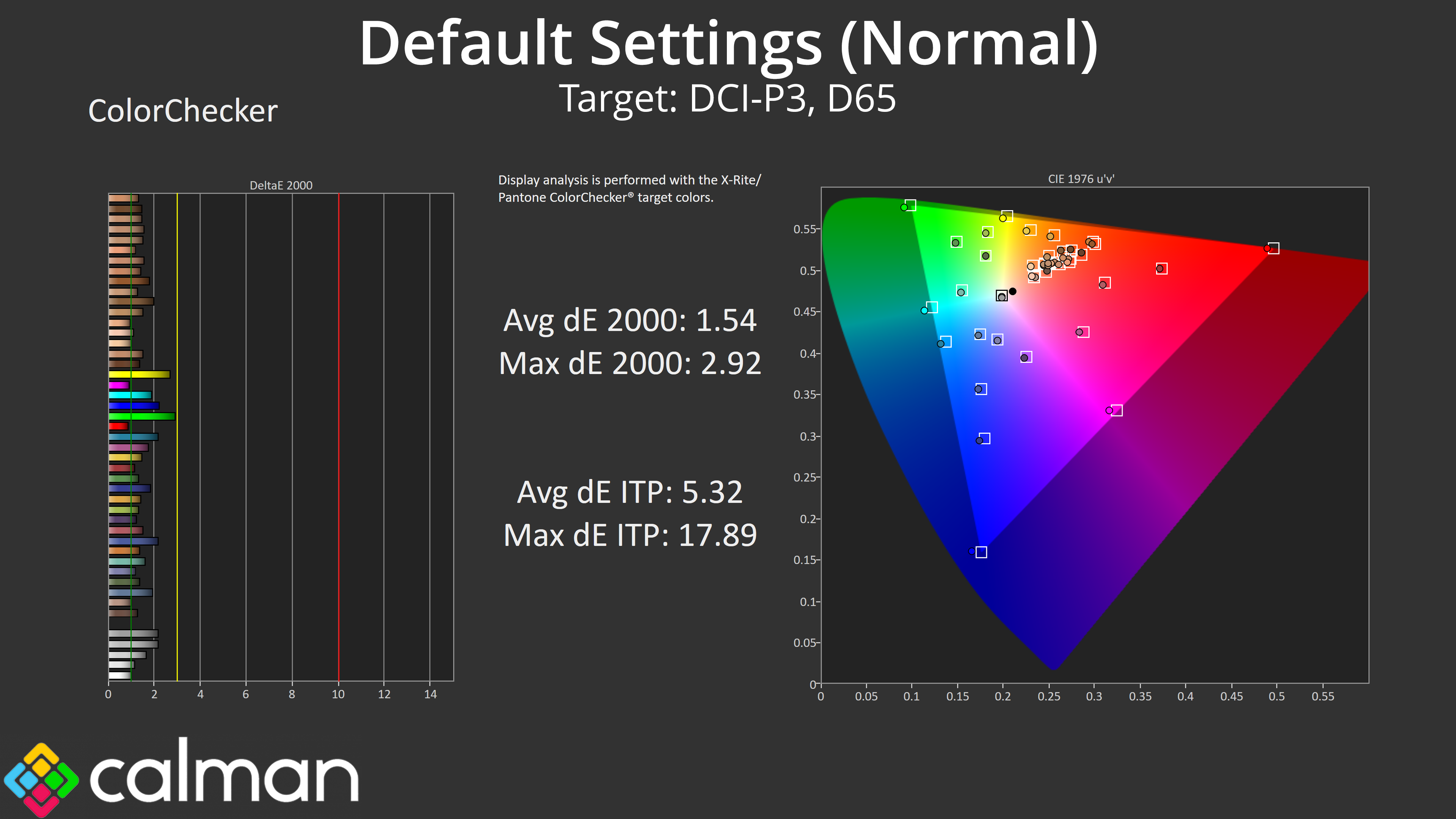 When comparing to the DCI-P3 colour space however, the results are significantly improved, with an average dE 2000 of just 1.46.