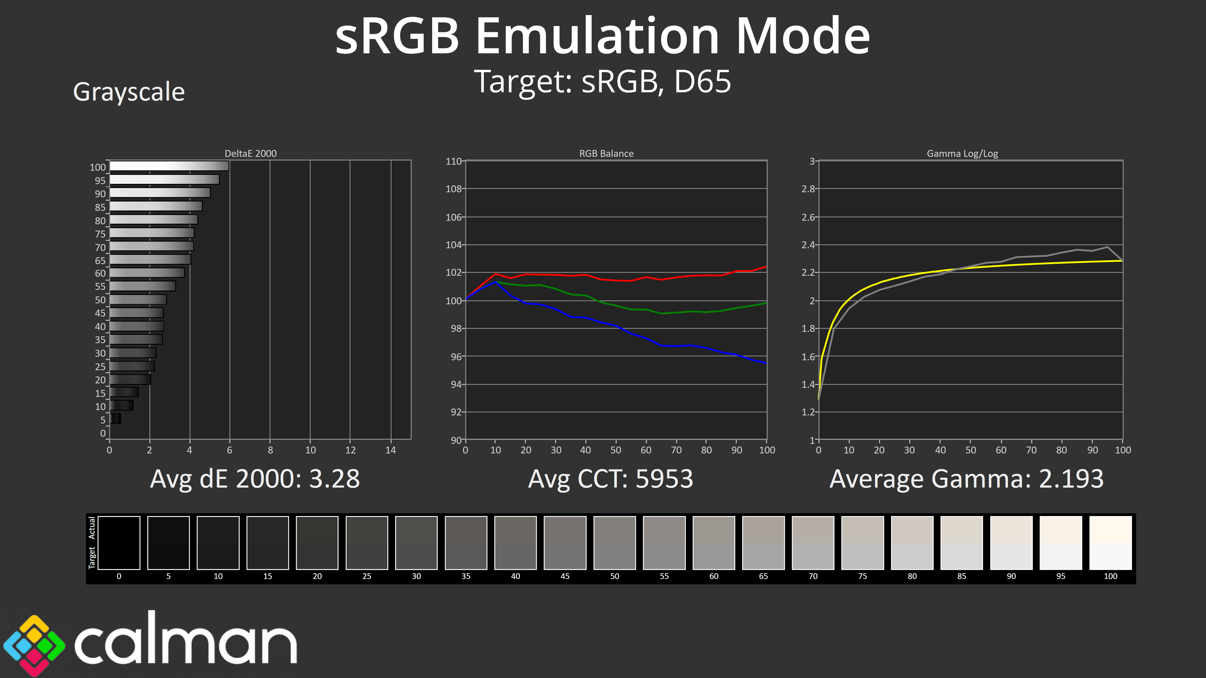 Using this sRGB mode also locks you out from manually adjusting colour temperature, which is always a pain, and it seems this mode is based on the ‘Warm' colour balance profile, as we once again get results that are noticeably warm, with an average CCT of 5953K. Gamma tracking is very good in this mode however, averaging 2.19.