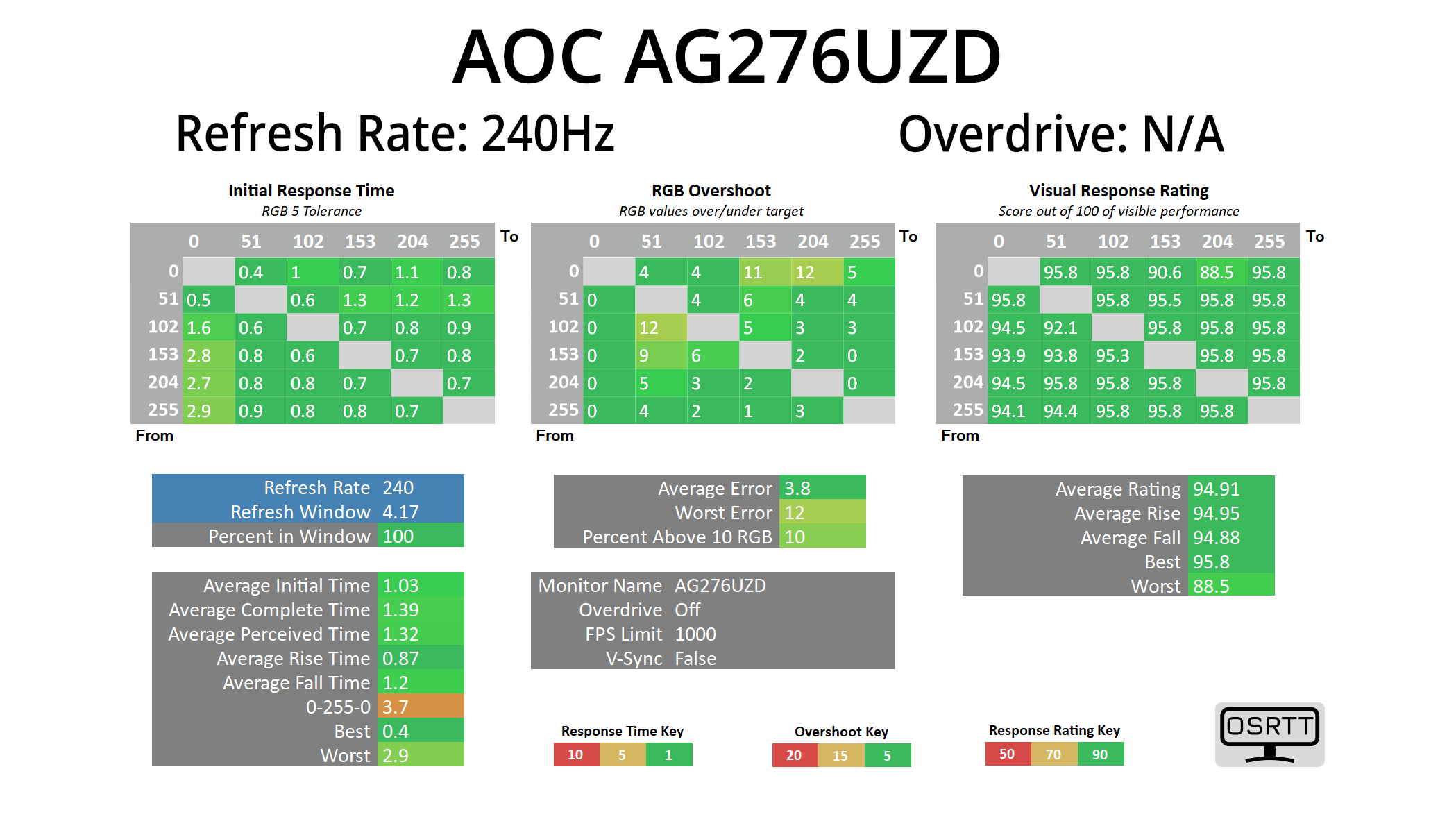 We use the Open Source Response Time Tool (OSRTT), developed by TechTeamGB, for our response time testing. This measures grey-to-grey response times and presents the results in a series of heatmaps, the style of which you may be familiar with from other reviews.