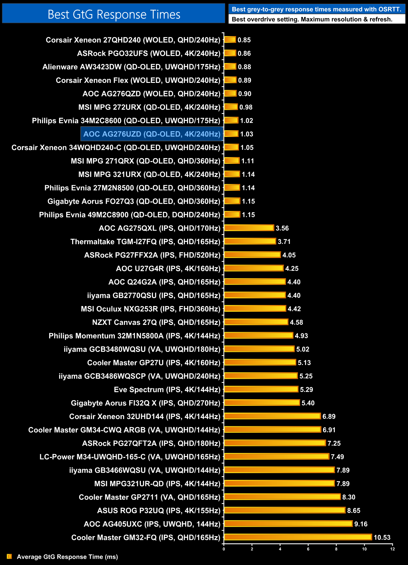 For final confirmation of the response time performance, we can see all the OLED monitors I've tested are grouped together at the top of the chart, with the AG276UZD sitting in the middle.