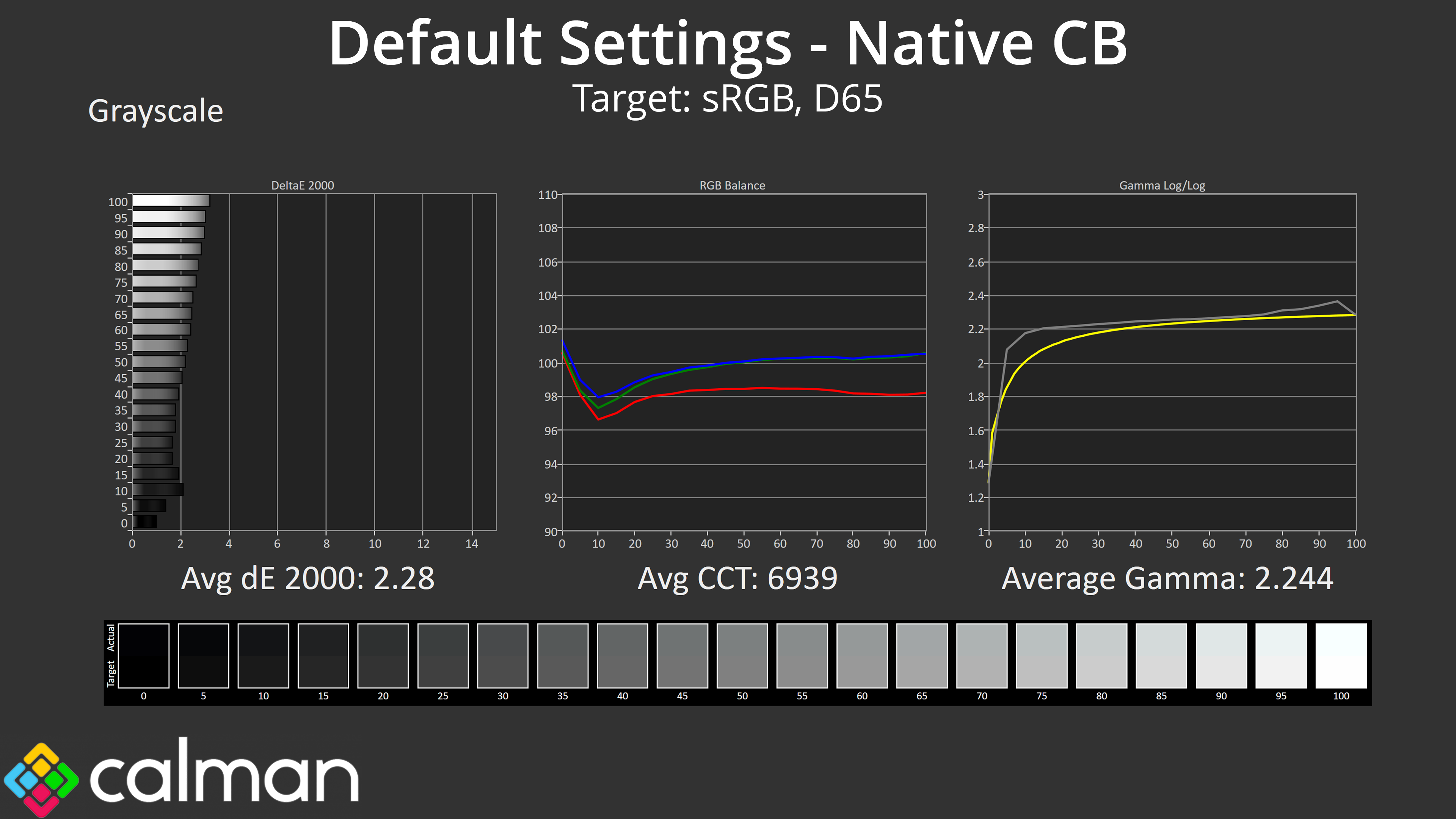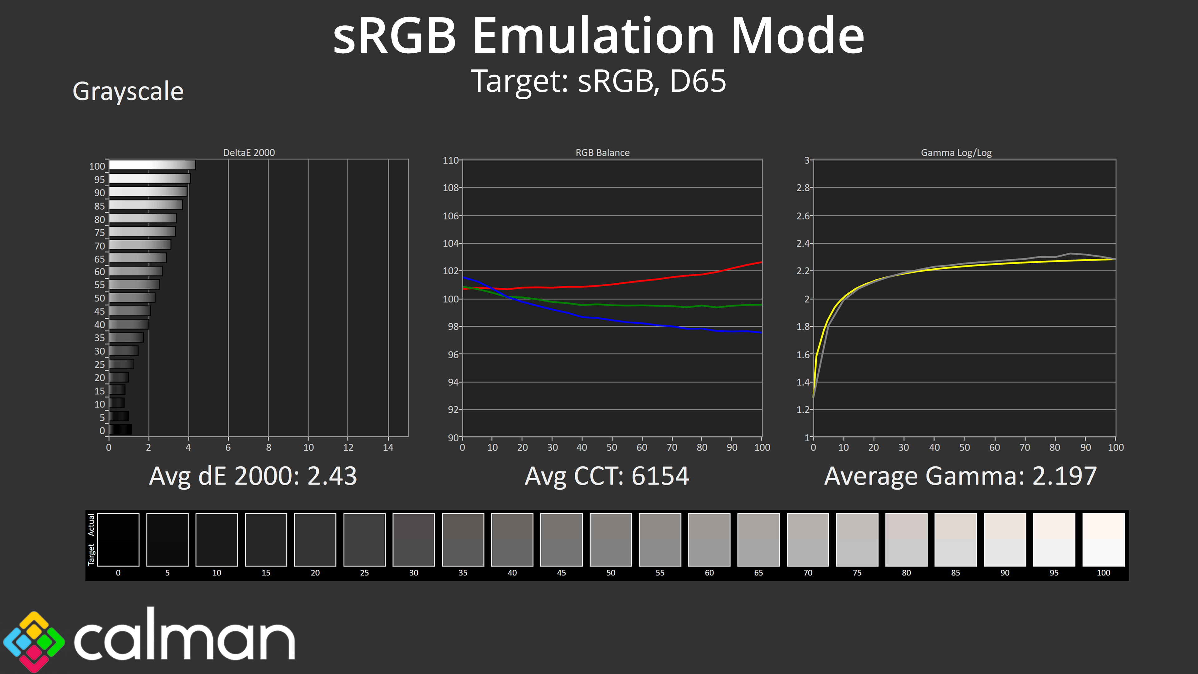 Next we have the sRGB emulation mode which clamps the gamut to prevent over-saturation. This makes a small improvement to greyscale, with a slightly more accurate colour balance, averaging a deltaE 2000 of 2.43, while gamma tracking is basically spot on.
