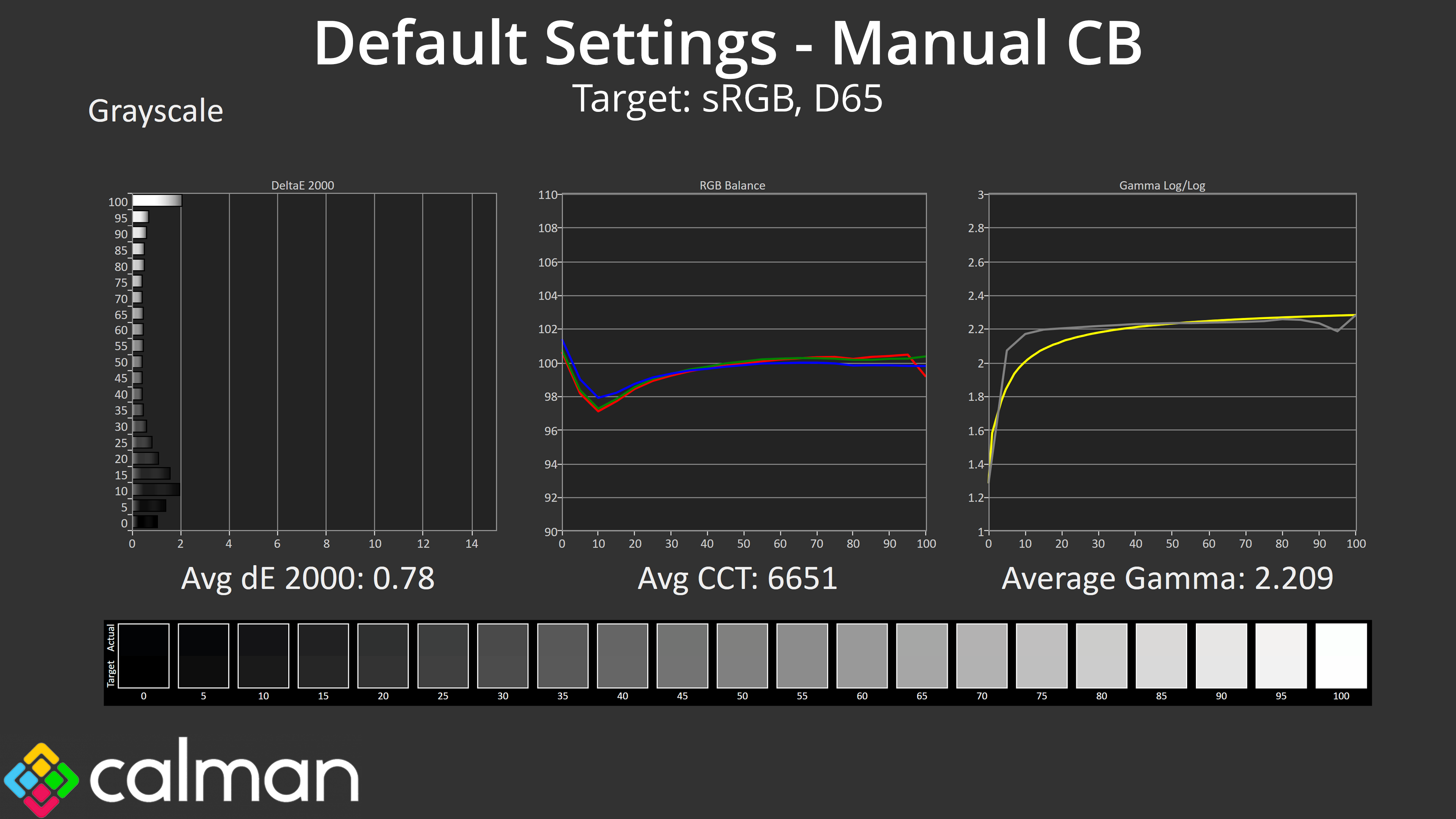 With just a couple of very brief tweaks using the manual colour balance, I was able to achieve an average greyscale dE 2000 of just 0.78. This was with the Red channel at 51, Green and Blue channels at 49.