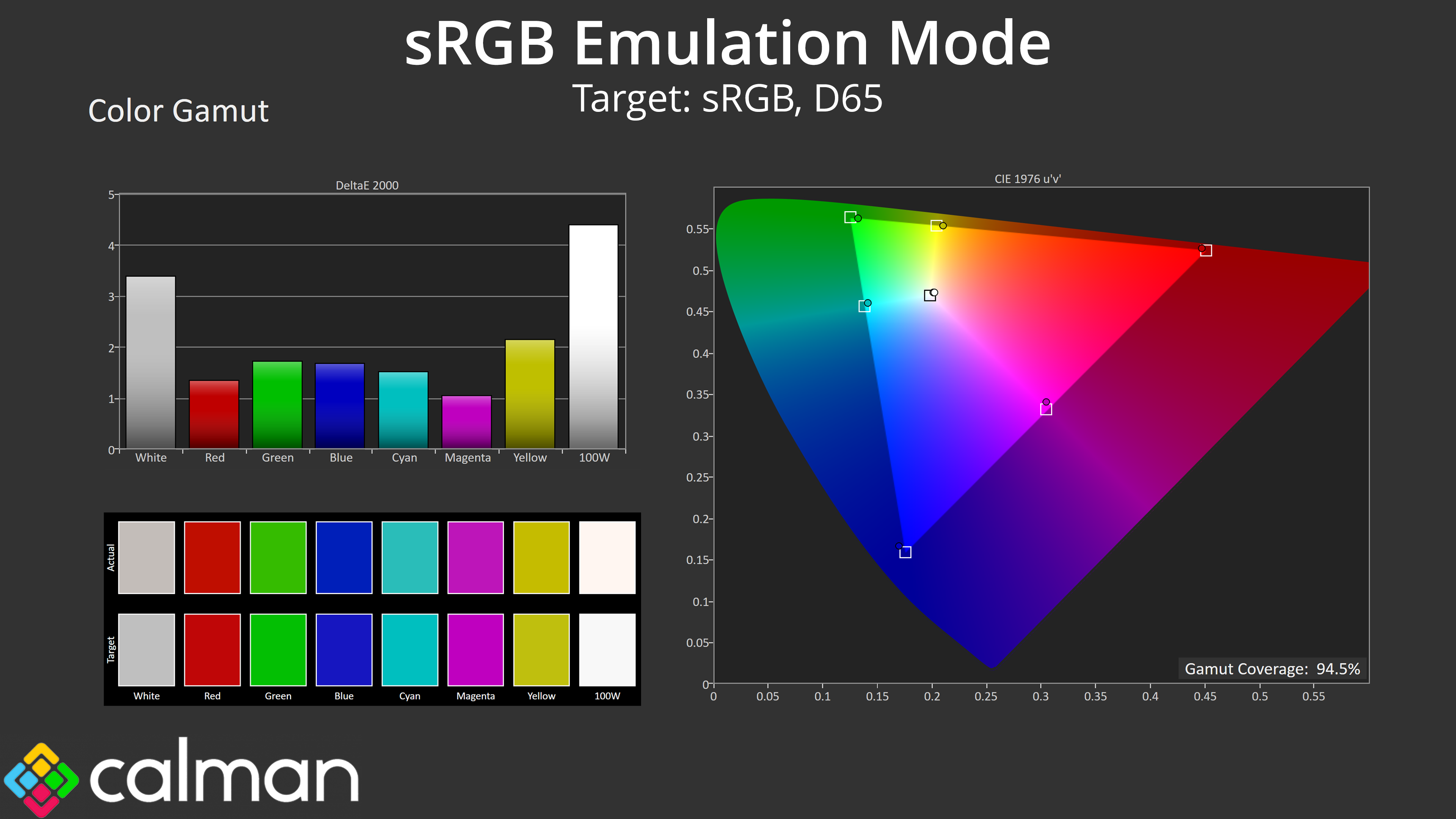 The DCI-P3 mode is arguably the best of the lot, with accurate greyscale and both saturation and colour accuracy average deltaEs below 2. I'm happy to recommend using any of these emulation modes if you need to work with these colour spaces.
