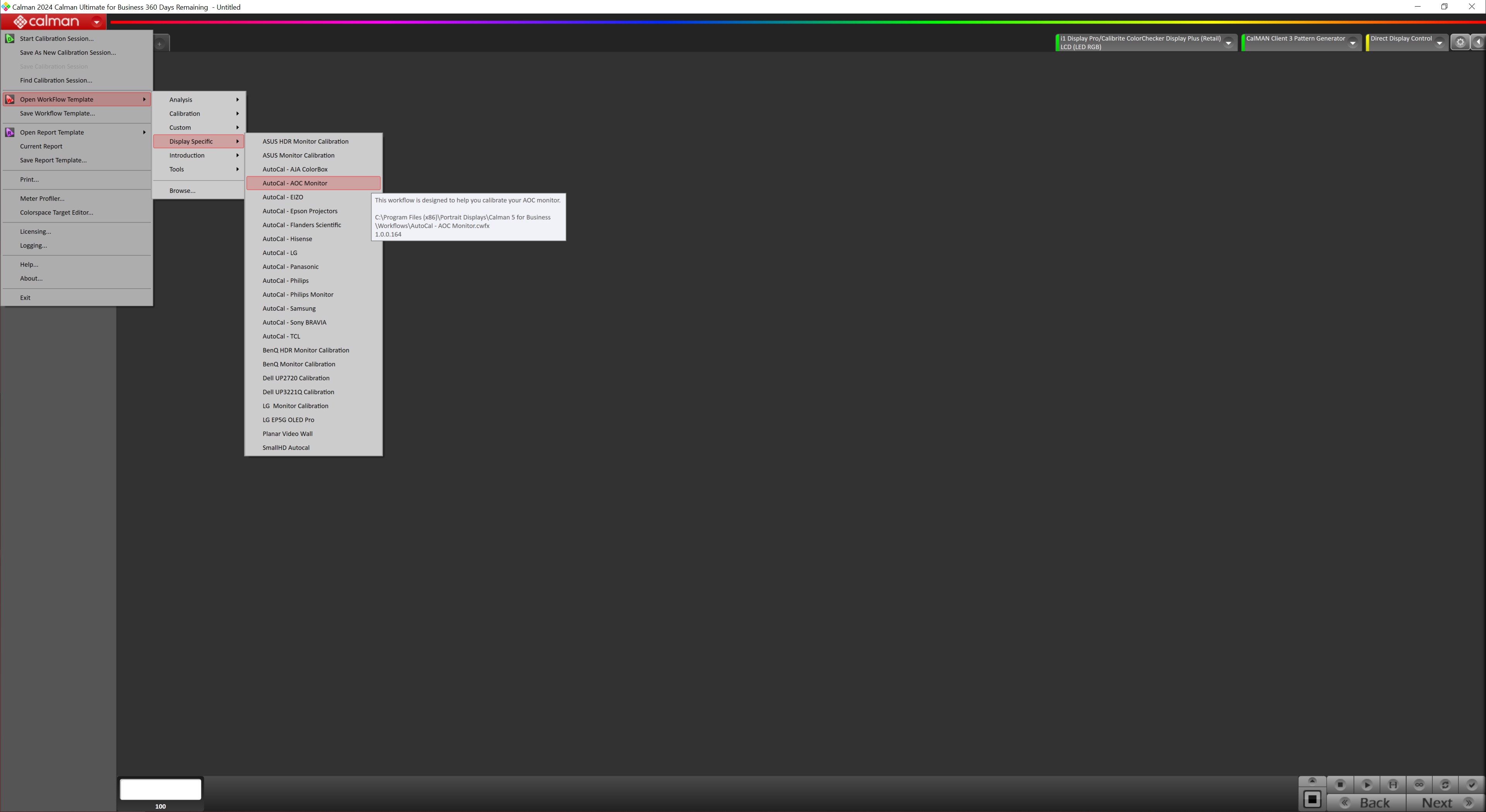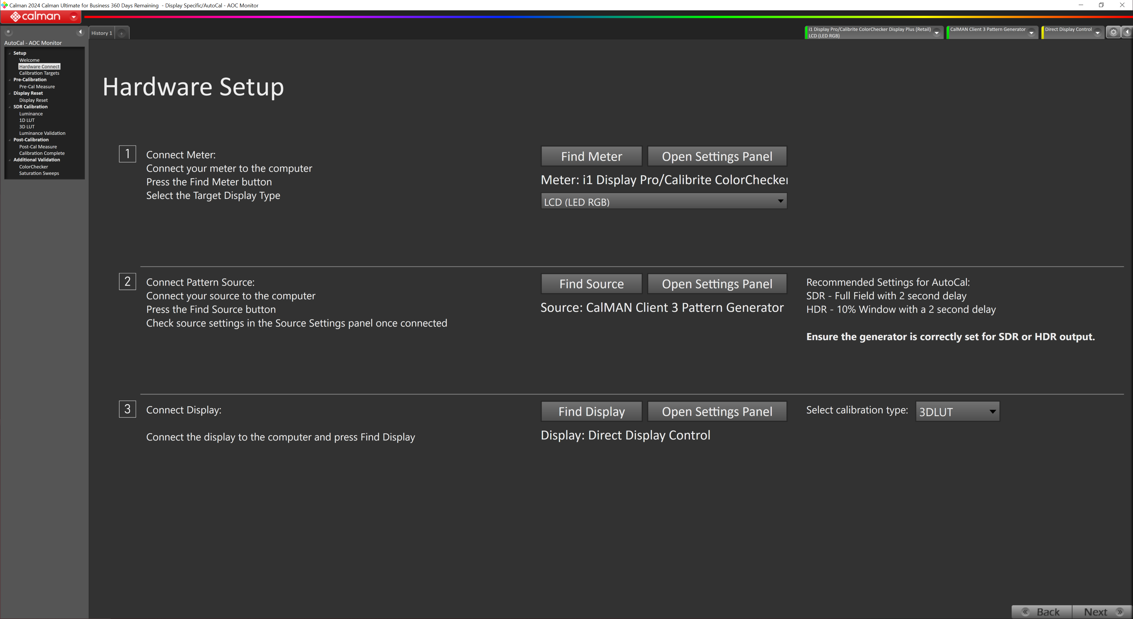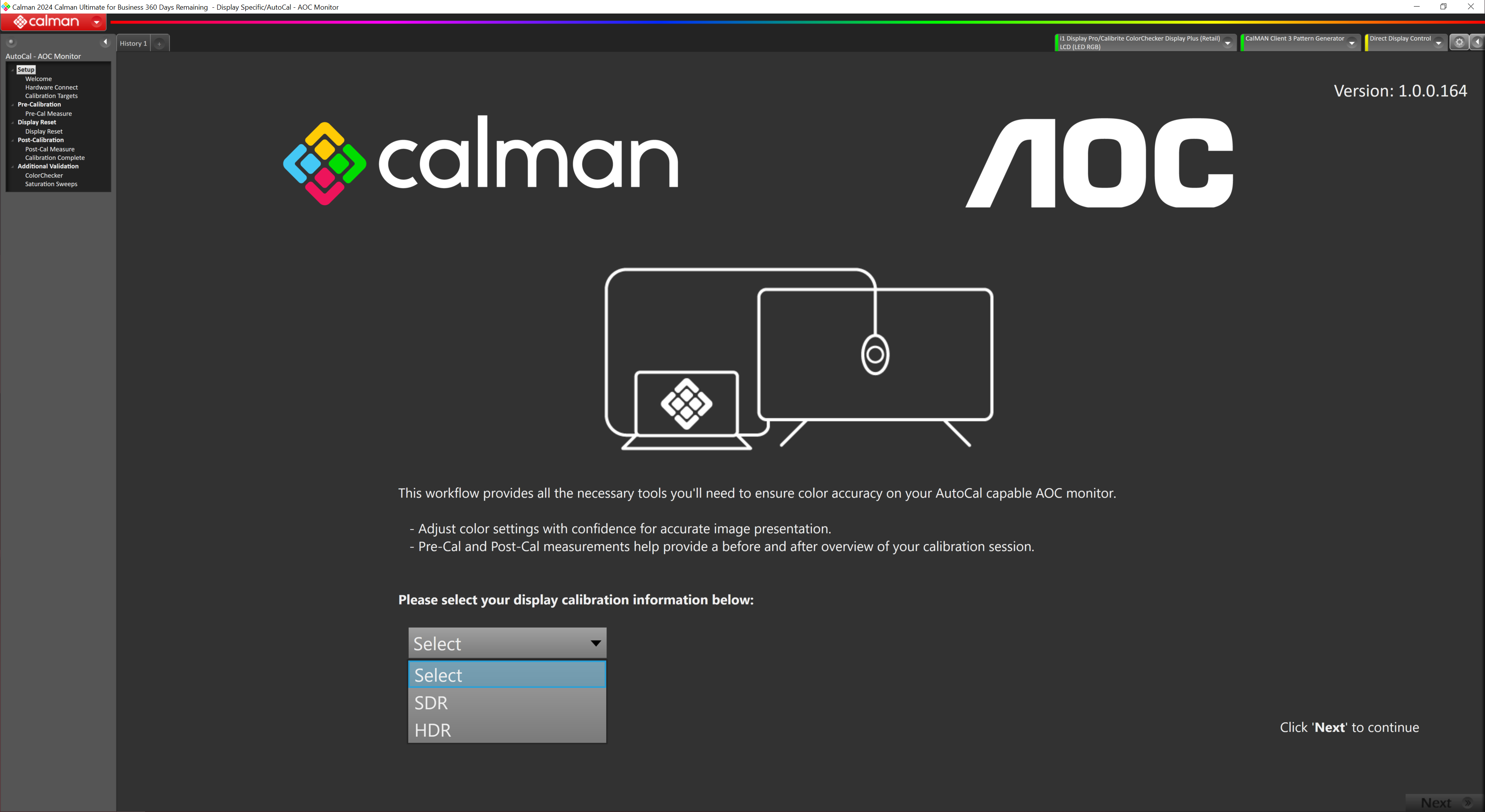 The first stage is to navigate to a display-specific workflow – calibrating an AOC monitor. You can then choose either SDR or HDR calibration.