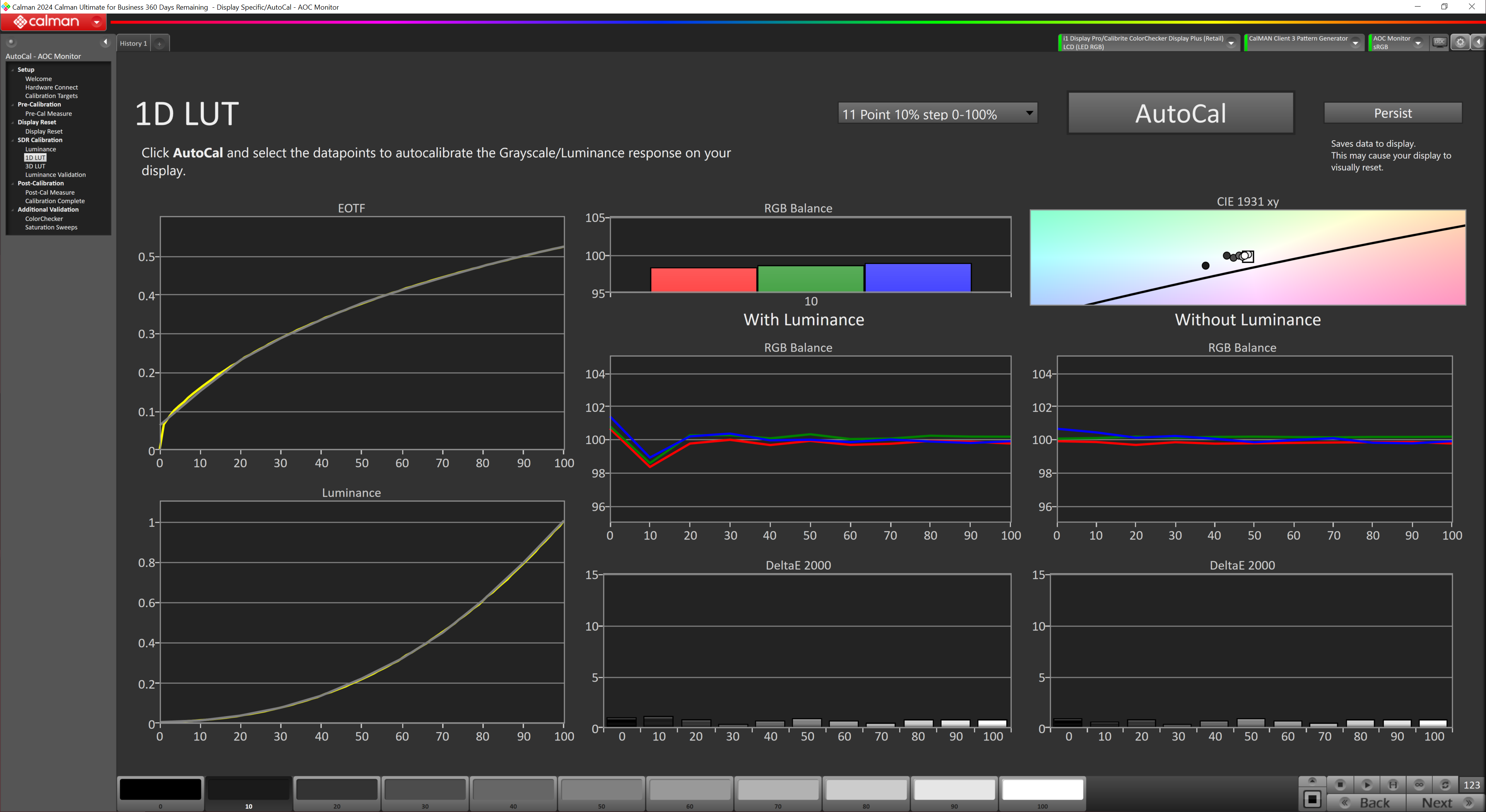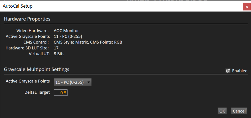 The next window brings us to the 1D LUT calibration process. Hitting the ‘AutoCal' button brings up a pop-ip window where you can choose the desired number of active greyscale points, which we left at 11, with a deltaE target of 0.5.
