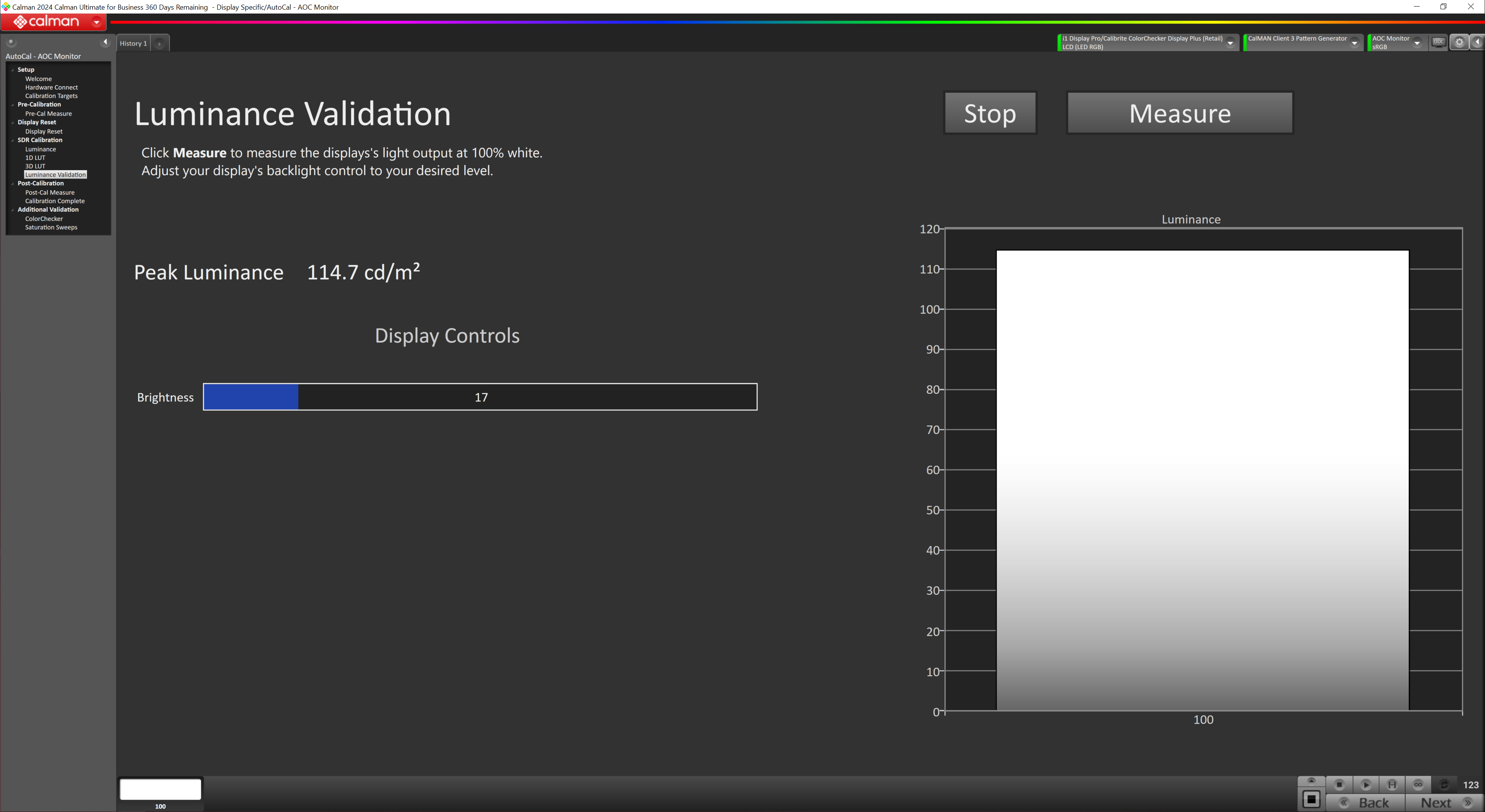 After that, the process will reset any previously saved profiles, before taking you onto the luminance verification check. Calman recommends aiming for a brightness level that's 15% above your actual target, as some brightness is lost during the calibration process.