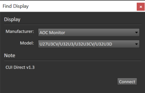 The hardware setup page ensures you have your meter and pattern generator connected – we're using the X-rite i1 Display Pro Plus and Calman Client 3, respectively. Then you have to connect to the monitor, ensuring a USB cable is hooked up from one of the U32U3CV's USB-C ports, before finding the relevant AOC models from the drop down menu.