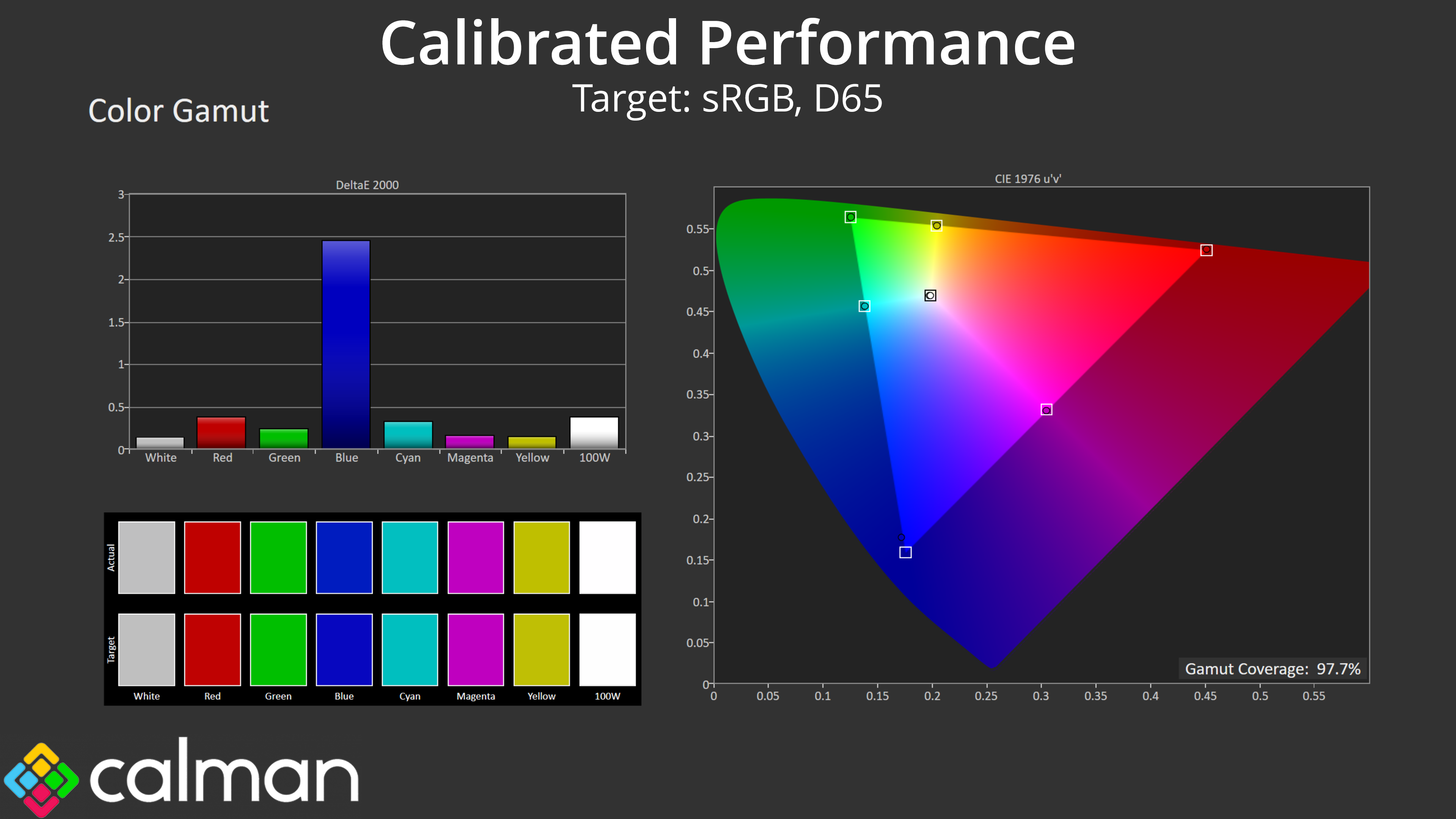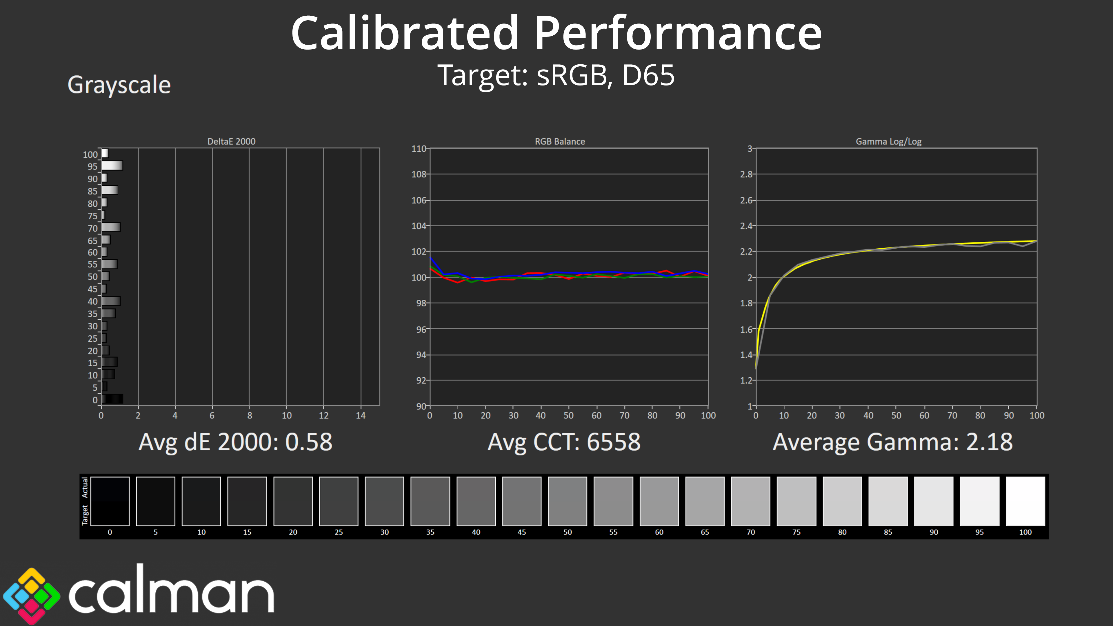 As you can see, the calibration results are generally stellar. The 100% blue channel didn't lock in quite as well as the rest, but an average deltaE 2000 of just 0.41 is still astonishing for the colour accuracy test. Greyscale performance is also about as close to perfect as you can get, so we're very happy with these results.