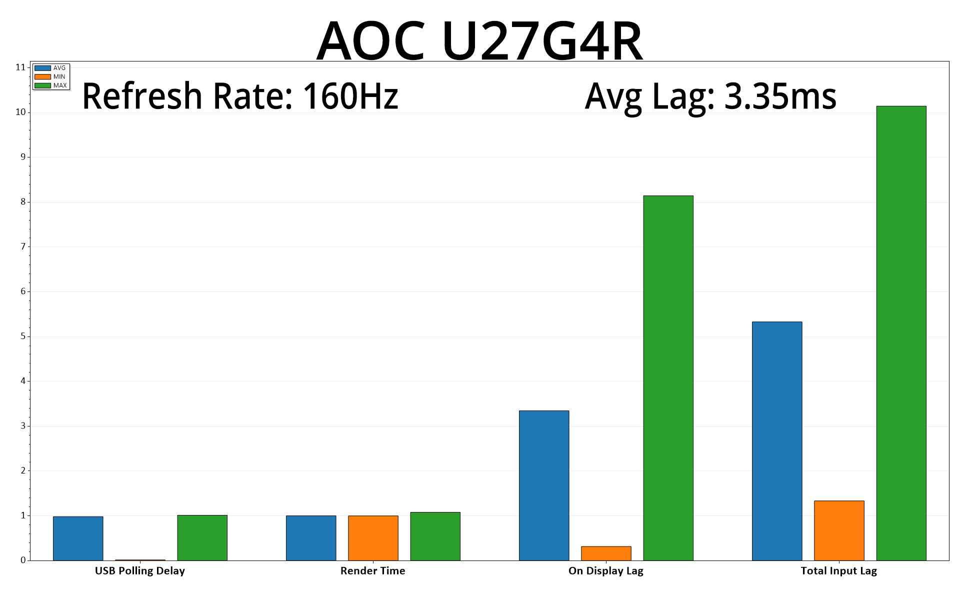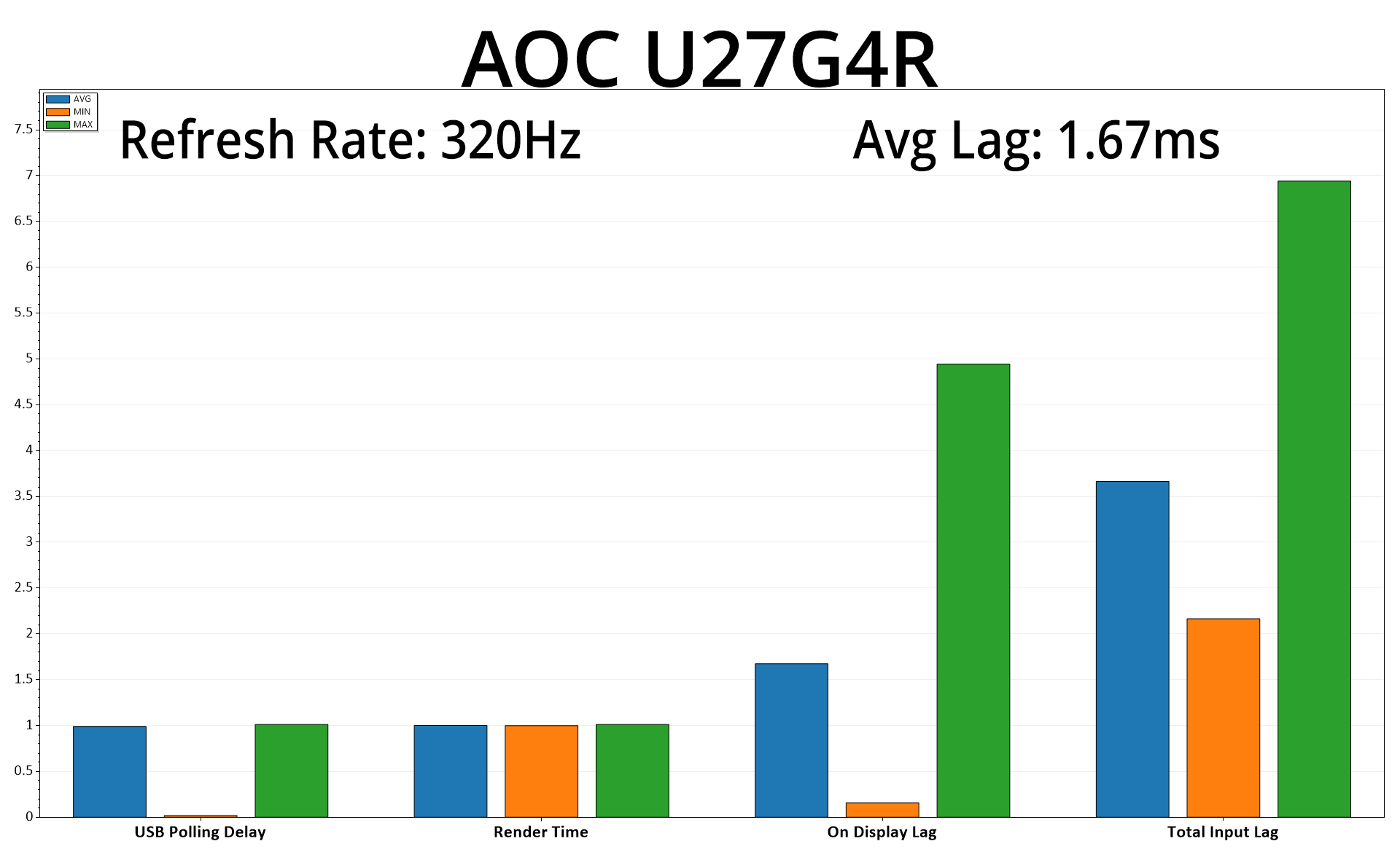 It's also good to confirm that latency is not a problem for the U27G4R, regardless of which mode you are using. In both instances, we see average lag that's equivalent to about half a frame of the chosen refresh rate, so really nothing to be concerned about.