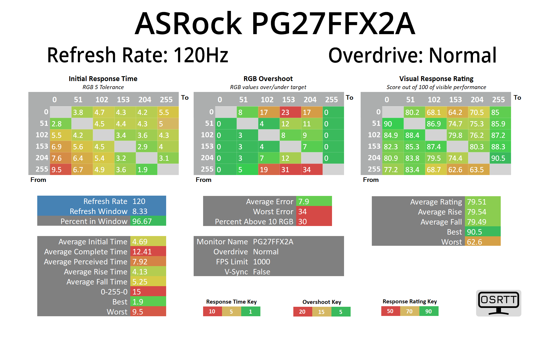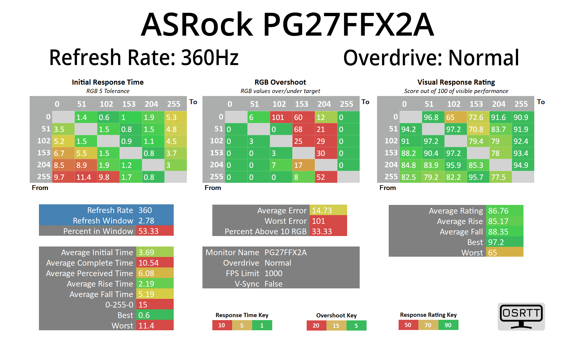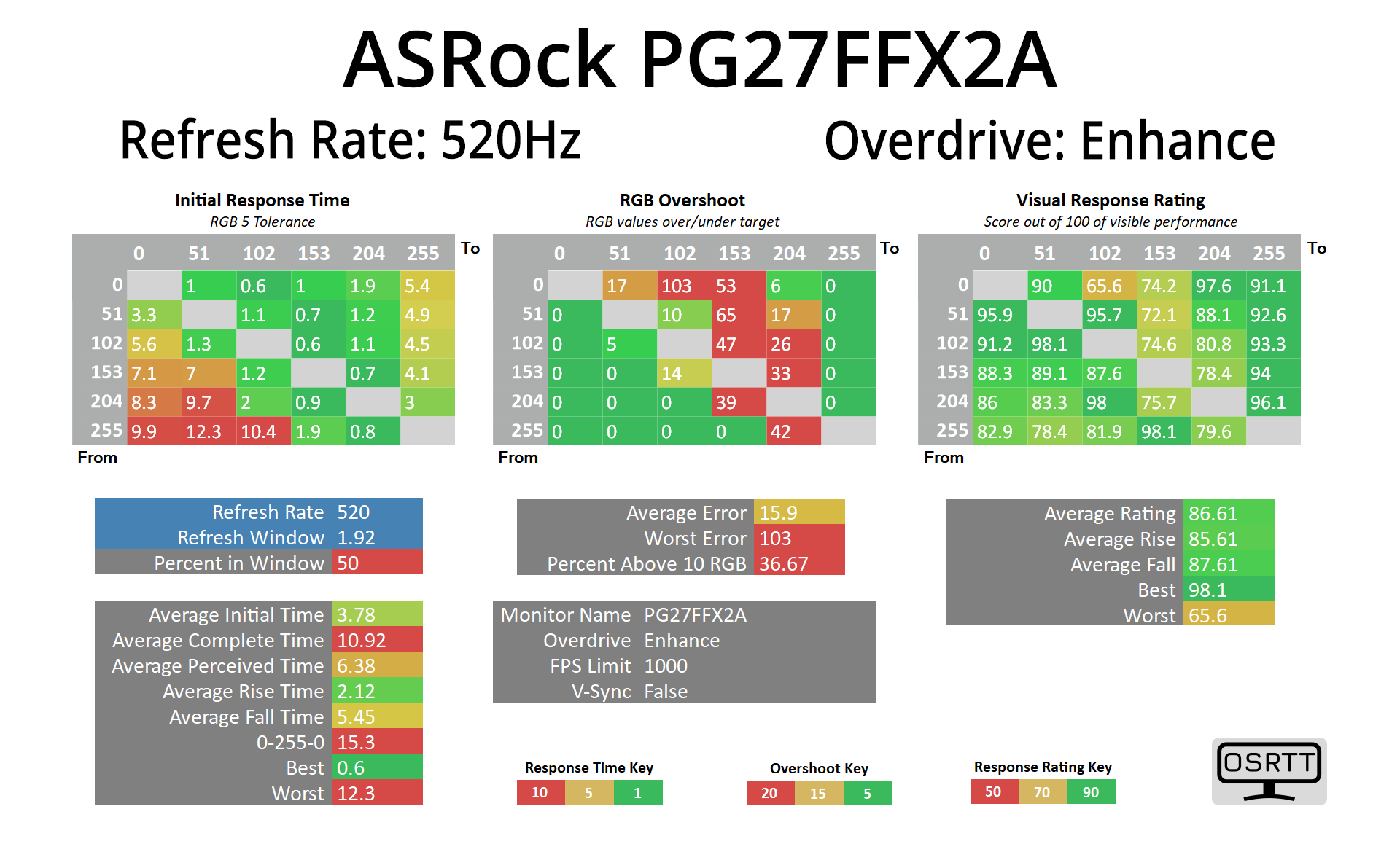 We use the Open Source Response Time Tool (OSRTT), developed by TechTeamGB, for our response time testing. This measures grey-to-grey response times and presents the results in a series of heatmaps, the style of which you may be familiar with from other reviews.