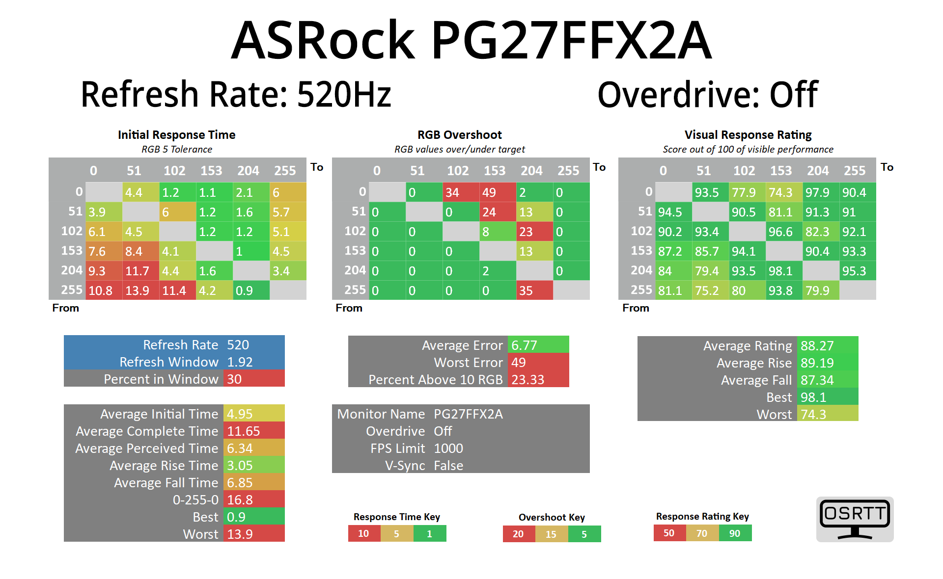 Starting at 520Hz with overdrive turned off, the results aren't bad at all – the average response time hits 4.95ms, and while there is some overshoot on a handful of transitions, it's not really noticeable.