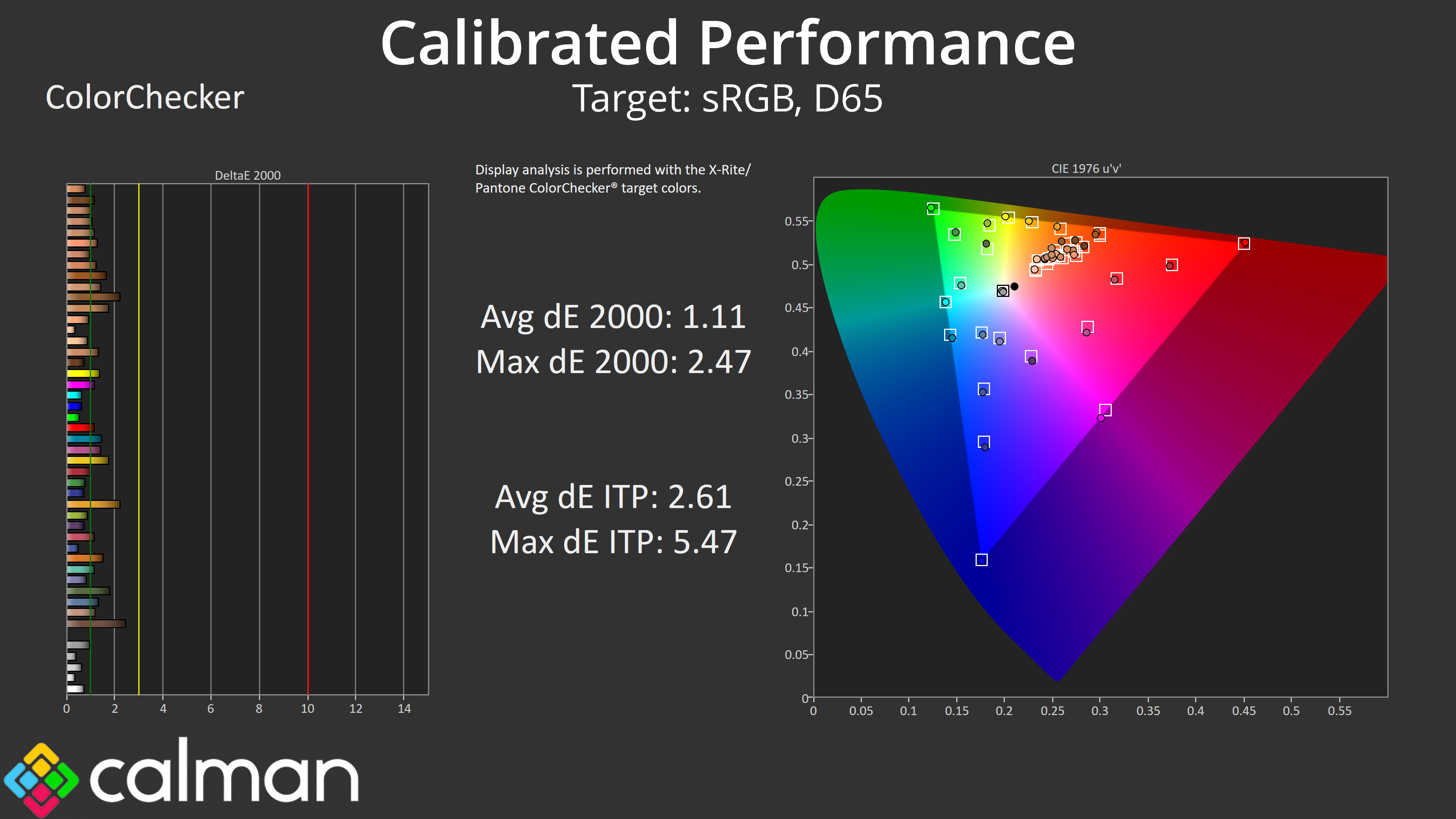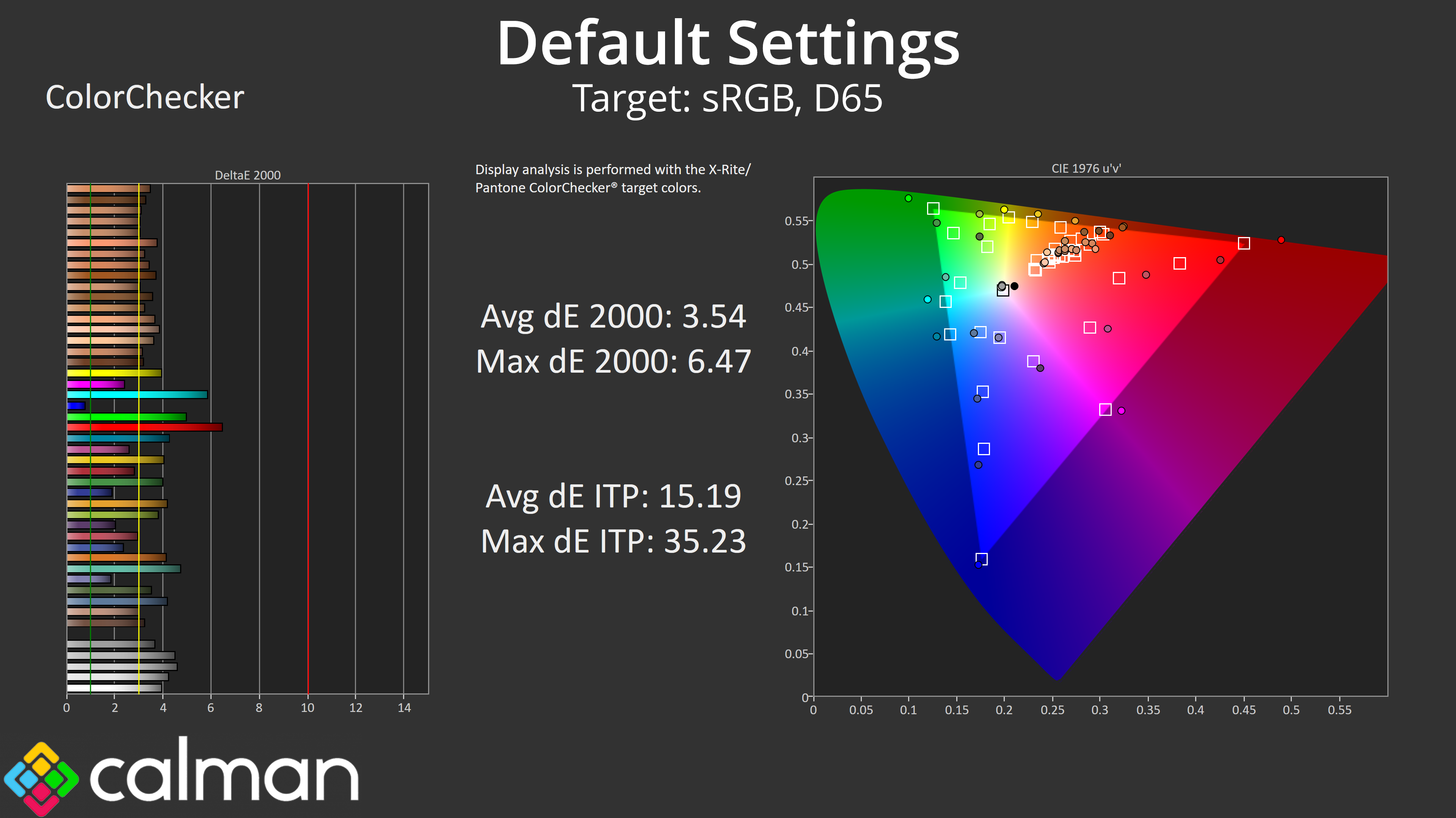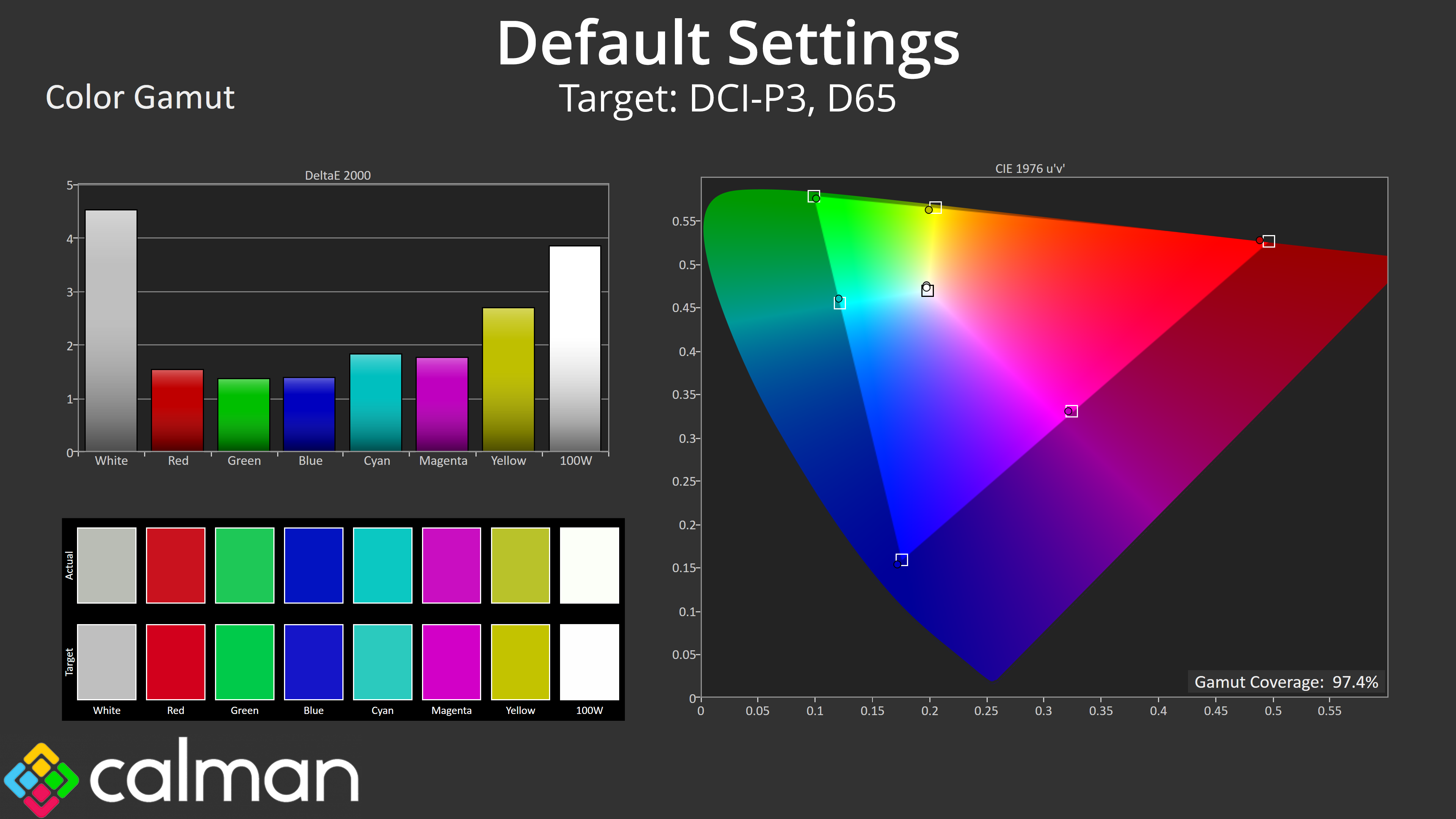 Things look better compared to the DCI-P3 space though, with an average dE 2000 of 2.37.